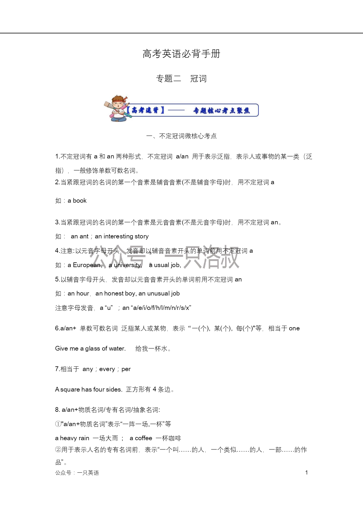 专题 02 高考英语语法【冠词】核心考点聚焦 -高考英语必背手册.doc