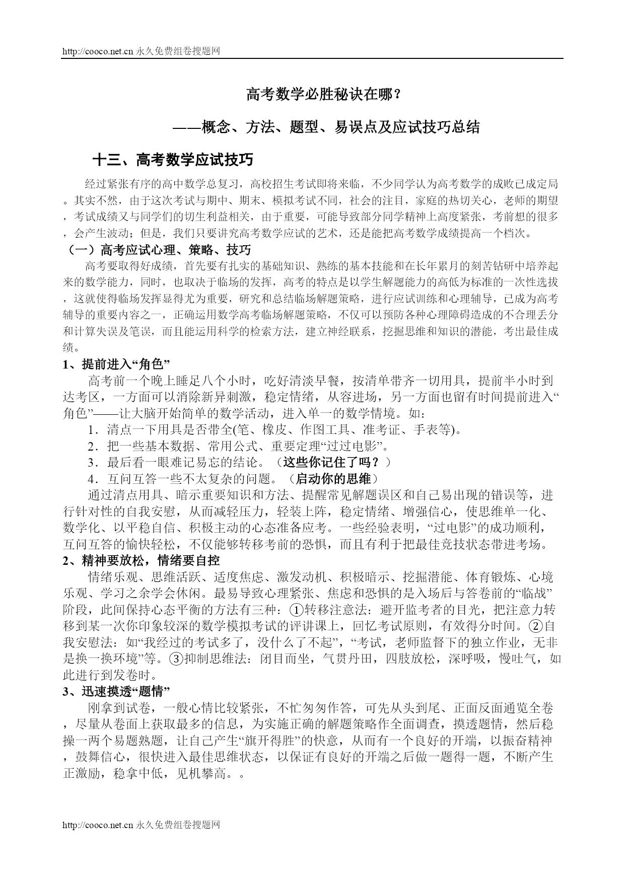 http://cooco.net.cn永久免费组卷搜题网http://cooco.net.cn永久免费组卷搜题网高考数学必胜秘诀在哪?――概念、方法、题型、易误点及应试技巧总结十三、高考数学应试技巧经过紧张有序的高中数学总复习,高校招生考试即将来临,不少同学认为高考数学的成败已成定局。其实不然,由于这次考试与期中、期末、模拟考试不同,社会的注目,家庭的热切关心,老师的期望,考试成绩又与同学们的切生利益相关,由于重要,可能导致部分同学精神上高度紧张,考前想的很多,会产生波动;但是,我们只要讲究高考数学应试的