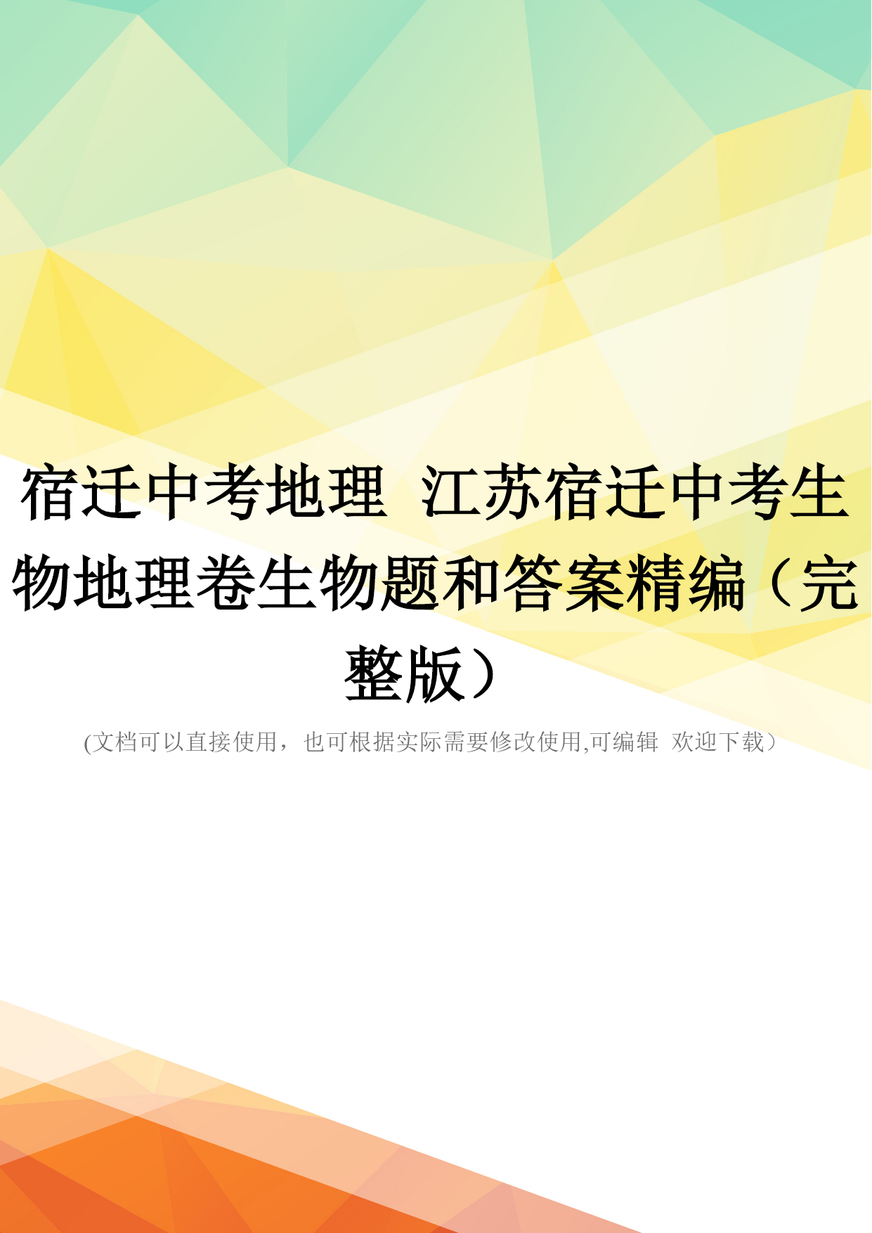 宿迁中考地理江苏宿迁中考生物地理卷生物题和答案精编(完整版)(文档可以直接使用,也可根据实际需要修改使用,可编辑欢迎下载)2021宿迁中考地理2021年江苏宿迁中考生物地理卷生物题和答案精编江苏宿迁市2021年初中毕业暨升学考试地理·生物(生物试题)一、选择题(每小题2分,共80分)1.地球上最大的生态系统是()A.生物圈B.海洋生态系统C.森林生态系统D.草原生态系统2.“小草依依,踏之何忍”。践踏草坪影响植物生长的主要原因是()A.缺少肥料,影响光合作用B.缺少水分,影响呼吸作用C.缺少二氧化碳,影响