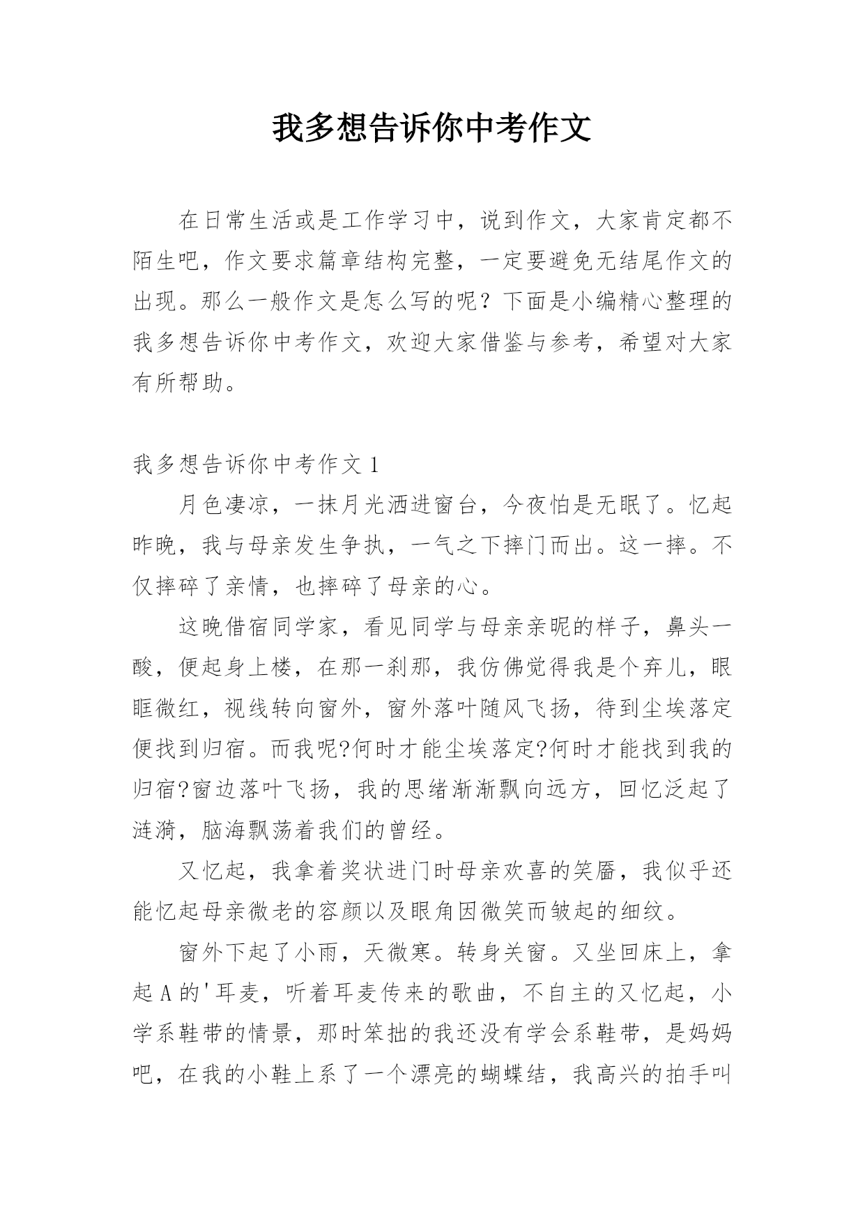 我多想告诉你中考作文在日常生活或是工作学习中,说到作文,大家肯定都不陌生吧,作文要求篇章结构完整,一定要避免无结尾作文的出现。那么一般作文是怎么写的呢?下面是小编精心整理的我多想告诉你中考作文,欢迎大家借鉴与参考,希望对大家有所帮助。我多想告诉你中考作文1月色凄凉,一抹月光洒进窗台,今夜怕是无眠了。忆起昨晚,我与母亲发生争执,一气之下摔门而出。这一摔。不仅摔碎了亲情,也摔碎了母亲的心。这晚借宿同学家,看见同学与母亲亲昵的样子,鼻头一酸,便起身上楼,在那一刹那,我仿佛觉得我是个弃儿,眼眶微红,视线转向窗外,