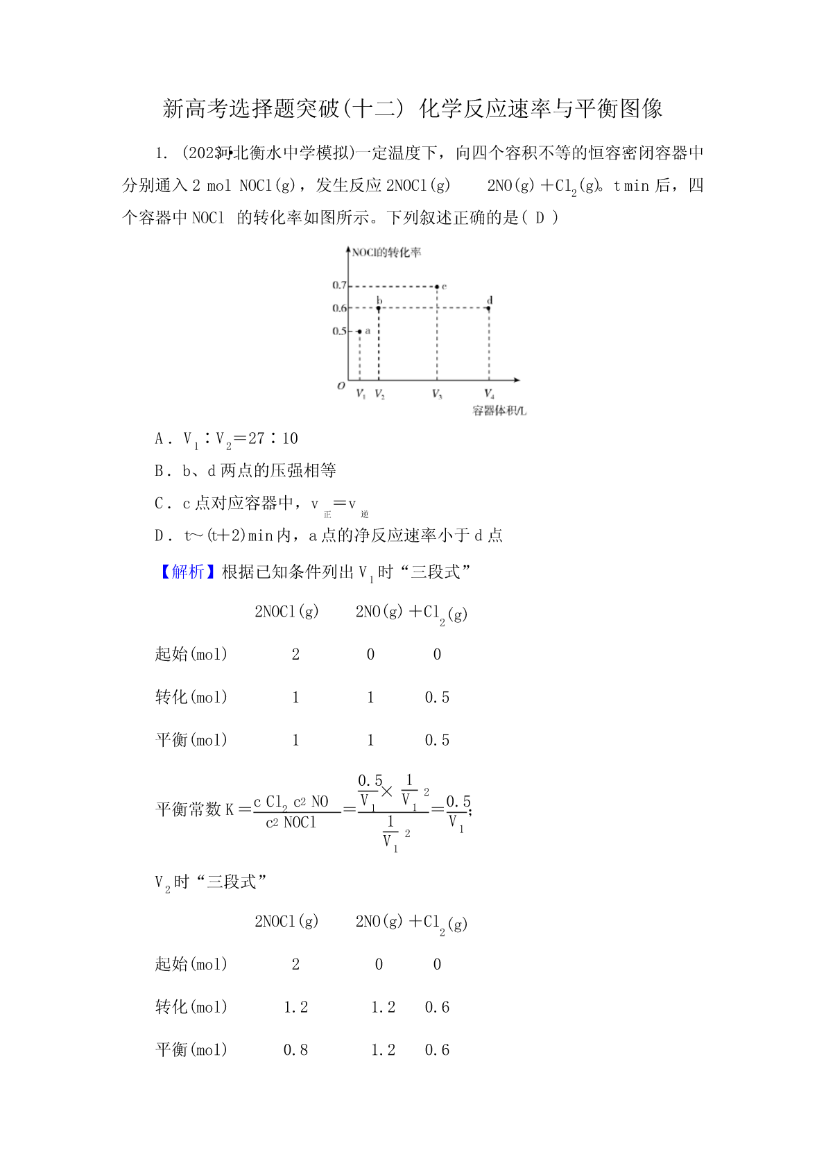 新高考选择题突破(十二)化学反应速率与平衡图像1.(2023·河北衡水中学模拟)一定温度下,向四个容积不等的恒容密闭容器中分别通入2molNOCl(g),发生反应2NOCl(g)2NO(g)+Cl2(g)。tmin后,四个容器中NOCl的转化率如图所示。下列叙述正确的是(D)A.V1∶V2=27∶10B.b、d两点的压强相等C.c点对应容器中,v=v正逆D.t~(t+2)min内,a点的净反应速率小于d点【解析】根据已知条件列出V1时“三段式”2NOCl(g)2NO(g)+Cl2(g)起始(mol)200