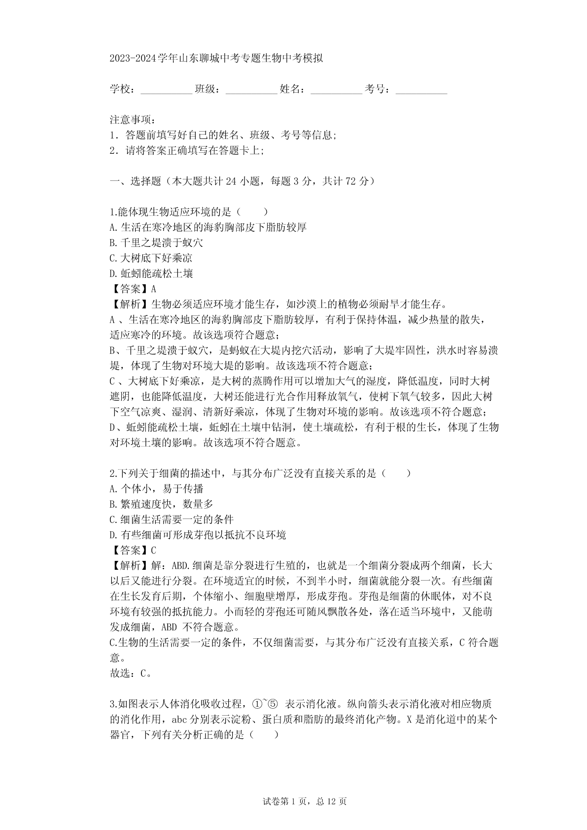 2023-2024学年山东聊城中考专题生物中考模拟学校:__________班级:__________姓名:__________考号:__________注意事项:1.答题前填写好自己的姓名、班级、考号等信息;2.请将答案正确填写在答题卡上;一、选择题(本大题共计24小题,每题3分,共计72分)1.能体现生物适应环境的是()A.生活在寒冷地区的海豹胸部皮下脂肪较厚B.千里之堤溃于蚁穴C.大树底下好乘凉D.蚯蚓能疏松土壤【答案】A【解析】生物必须适应环境才能生存,如沙漠上的植物必须耐旱才能生存。A、生活在寒