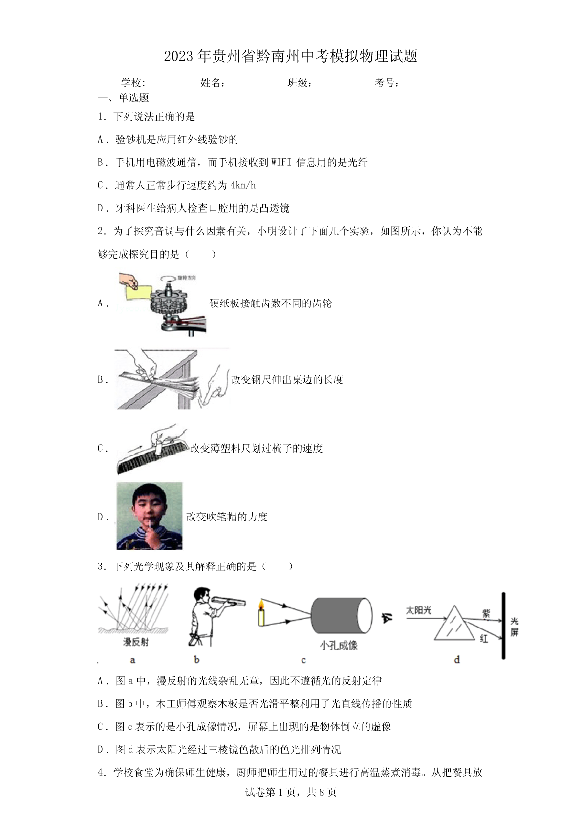 2023年贵州省黔南州中考模拟物理试题学校:___________姓名:___________班级:___________考号:___________一、单选题1.下列说法正确的是A.验钞机是应用红外线验钞的B.手机用电磁波通信,而手机接收到WIFI信息用的是光纤C.通常人正常步行速度约为4km/hD.牙科医生给病人检查口腔用的是凸透镜2.为了探究音调与什么因素有关,小明设计了下面几个实验,如图所示,你认为不能够完成探究目的是()A.硬纸板接触齿数不同的齿轮B.改变钢尺伸出桌边的长度C.改变薄塑料尺划过梳