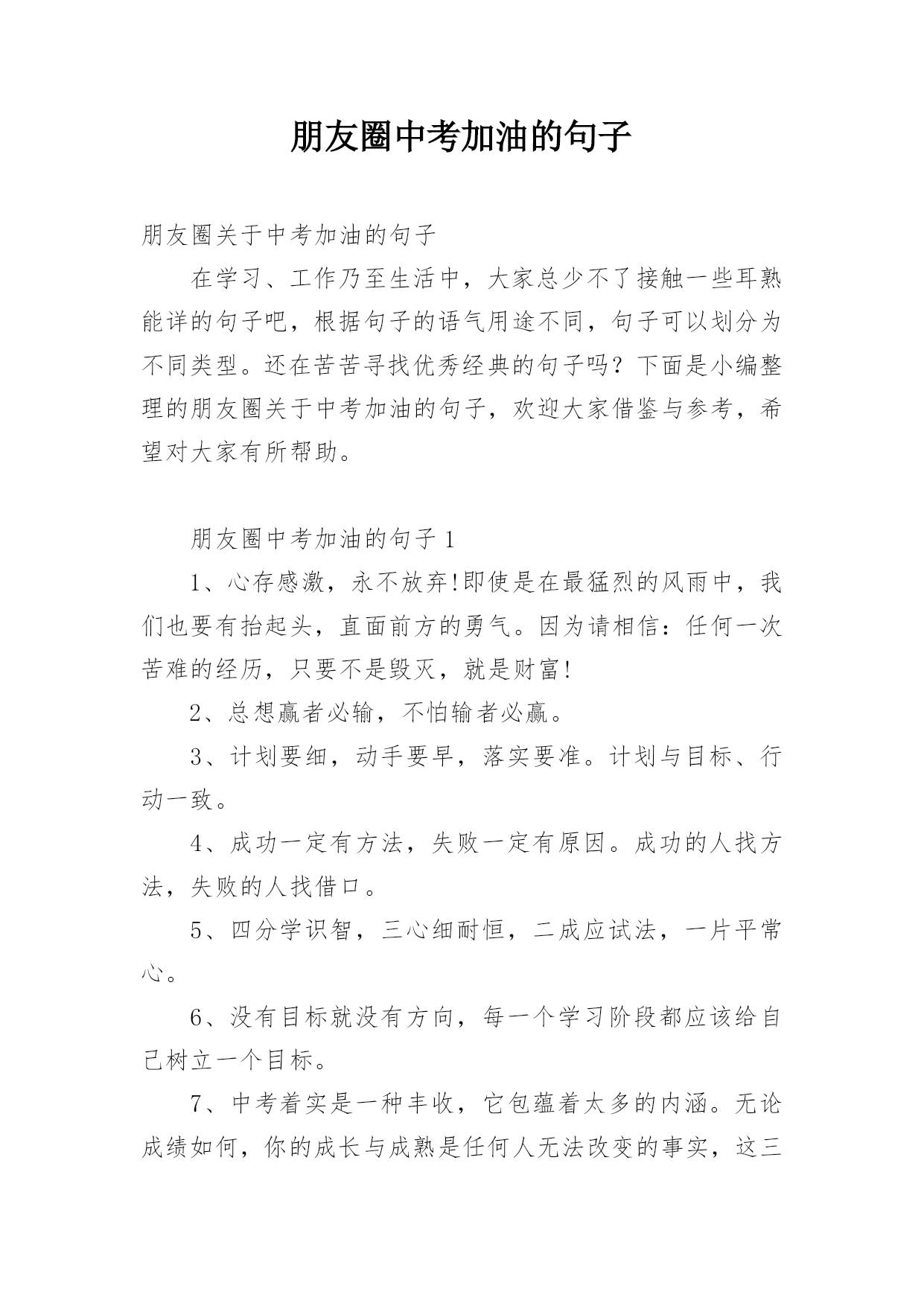 朋友圈中考加油的句子朋友圈关于中考加油的句子在学习、工作乃至生活中,大家总少不了接触一些耳熟能详的句子吧,根据句子的语气用途不同,句子可以划分为不同类型。还在苦苦寻找优秀经典的句子吗?下面是小编整理的朋友圈关于中考加油的句子,欢迎大家借鉴与参考,希望对大家有所帮助。朋友圈中考加油的句子11、心存感激,永不放弃!即使是在最猛烈的风雨中,我们也要有抬起头,直面前方的勇气。因为请相信:任何一次苦难的经历,只要不是毁灭,就是财富!2、总想赢者必输,不怕输者必赢。3、计划要细,动手要早,落实要准。计划与目标、行动一