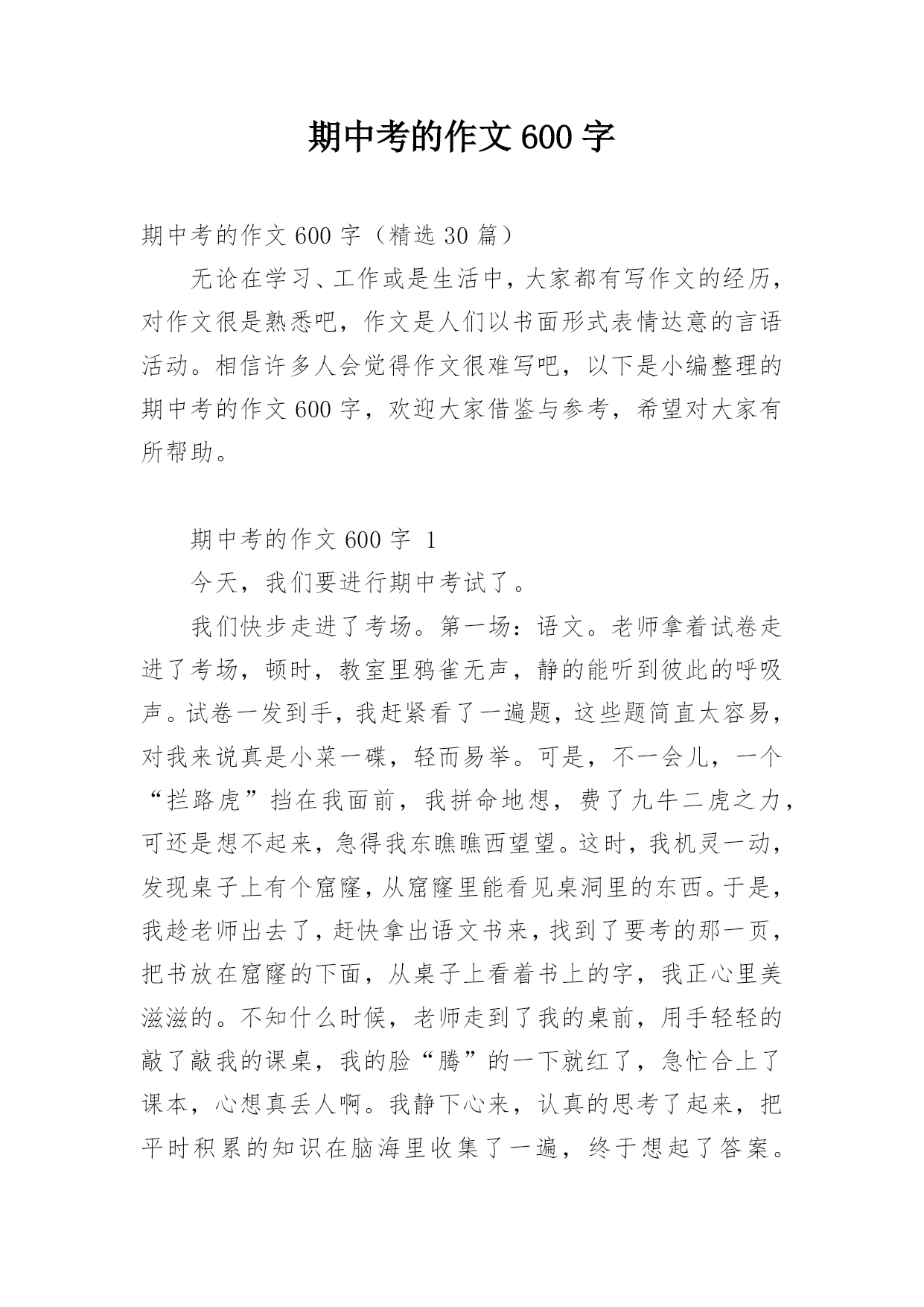 期中考的作文600字期中考的作文600字(精选30篇)无论在学习、工作或是生活中,大家都有写作文的经历,对作文很是熟悉吧,作文是人们以书面形式表情达意的言语活动。相信许多人会觉得作文很难写吧,以下是小编整理的期中考的作文600字,欢迎大家借鉴与参考,希望对大家有所帮助。期中考的作文600字1今天,我们要进行期中考试了。我们快步走进了考场。第一场:语文。老师拿着试卷走进了考场,顿时,教室里鸦雀无声,静的能听到彼此的呼吸声。试卷一发到手,我赶紧看了一遍题,这些题简直太容易,对我来说真是小菜一碟,轻而易举。可是