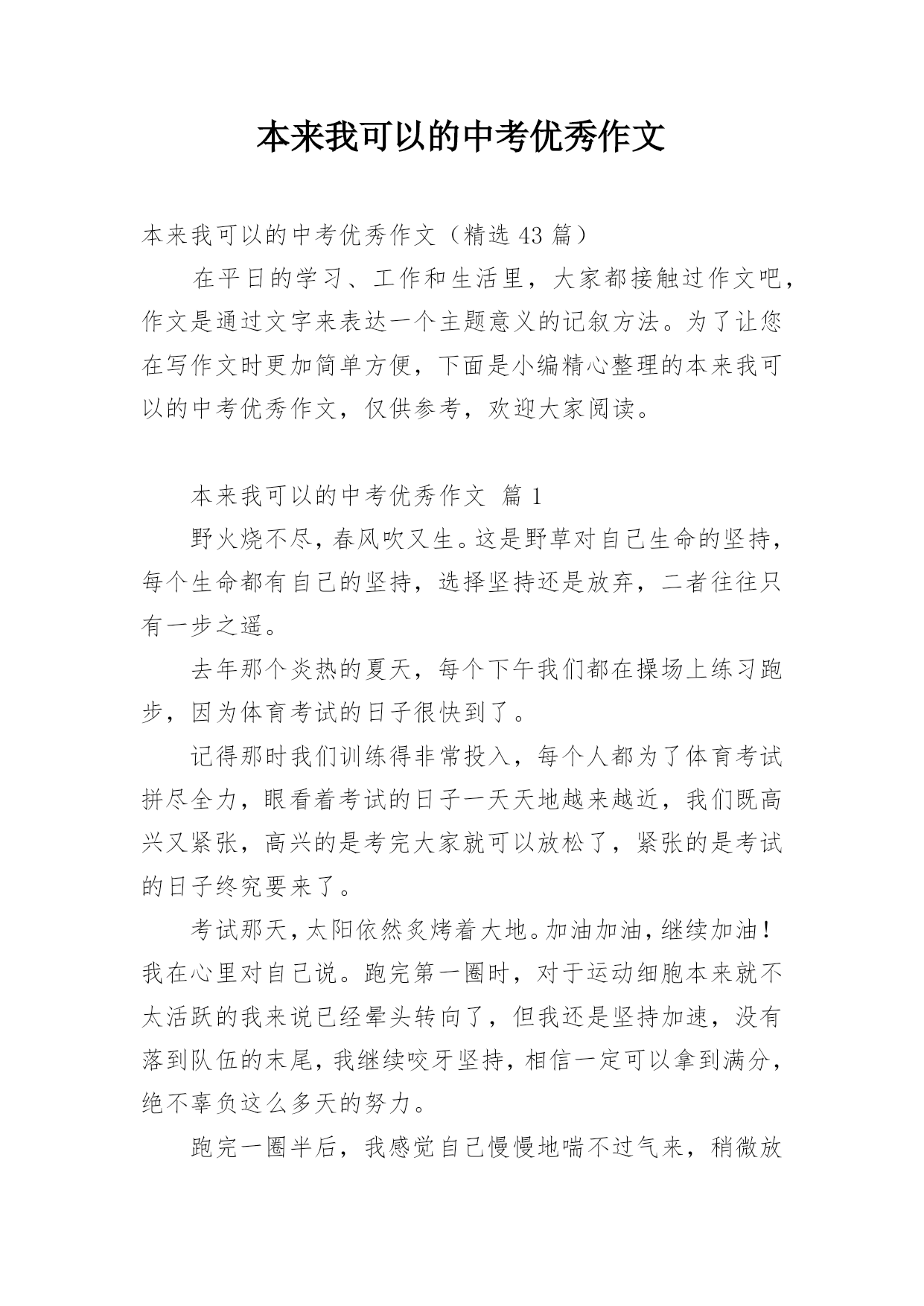 本来我可以的中考优秀作文本来我可以的中考优秀作文(精选43篇)在平日的学习、工作和生活里,大家都接触过作文吧,作文是通过文字来表达一个主题意义的记叙方法。为了让您在写作文时更加简单方便,下面是小编精心整理的本来我可以的中考优秀作文,仅供参考,欢迎大家阅读。本来我可以的中考优秀作文篇1野火烧不尽,春风吹又生。这是野草对自己生命的坚持,每个生命都有自己的坚持,选择坚持还是放弃,二者往往只有一步之遥。去年那个炎热的夏天,每个下午我们都在操场上练习跑步,因为体育考试的日子很快到了。记得那时我们训练得非常投入,每个