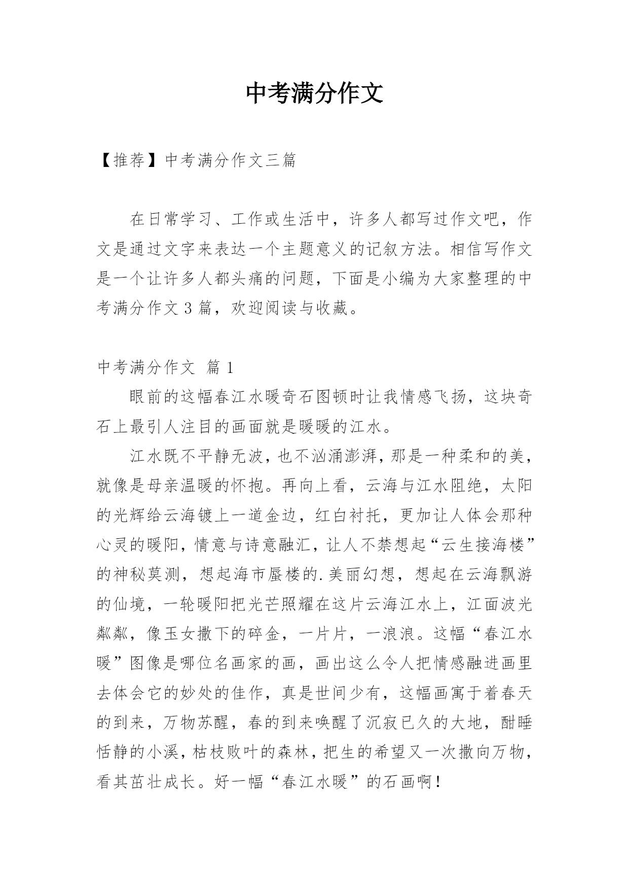 中考满分作文【推荐】中考满分作文三篇在日常学习、工作或生活中,许多人都写过作文吧,作文是通过文字来表达一个主题意义的记叙方法。相信写作文是一个让许多人都头痛的问题,下面是小编为大家整理的中考满分作文3篇,欢迎阅读与收藏。中考满分作文篇1眼前的这幅春江水暖奇石图顿时让我情感飞扬,这块奇石上最引人注目的画面就是暖暖的江水。江水既不平静无波,也不汹涌澎湃,那是一种柔和的美,就像是母亲温暖的怀抱。再向上看,云海与江水阻绝,太阳的光辉给云海镀上一道金边,红白衬托,更加让人体会那种心灵的暖阳,情意与诗意融汇,让人不禁