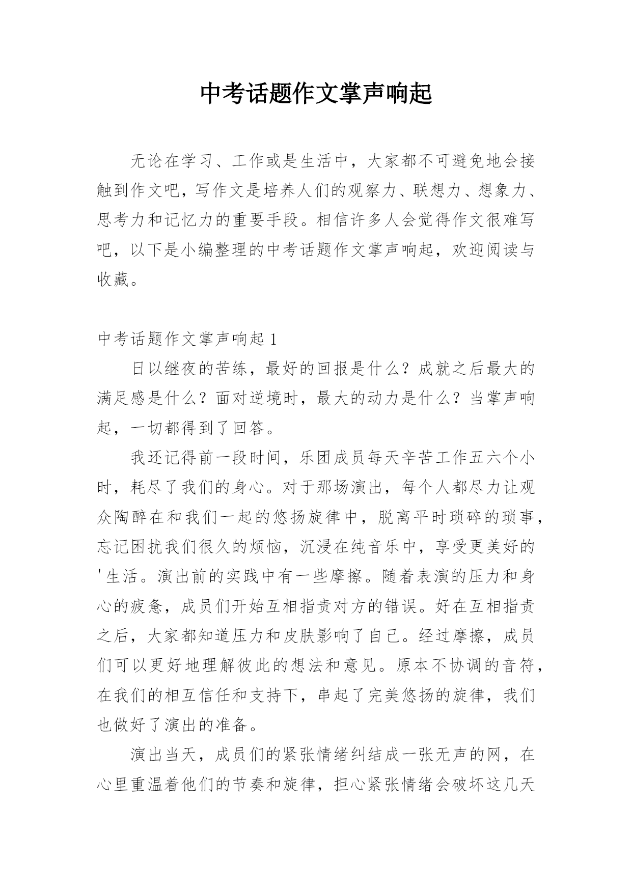 中考话题作文掌声响起无论在学习、工作或是生活中,大家都不可避免地会接触到作文吧,写作文是培养人们的观察力、联想力、想象力、思考力和记忆力的重要手段。相信许多人会觉得作文很难写吧,以下是小编整理的中考话题作文掌声响起,欢迎阅读与收藏。中考话题作文掌声响起1日以继夜的苦练,最好的回报是什么?成就之后最大的满足感是什么?面对逆境时,最大的动力是什么?当掌声响起,一切都得到了回答。我还记得前一段时间,乐团成员每天辛苦工作五六个小时,耗尽了我们的身心。对于那场演出,每个人都尽力让观众陶醉在和我们一起的悠扬旋律中,脱