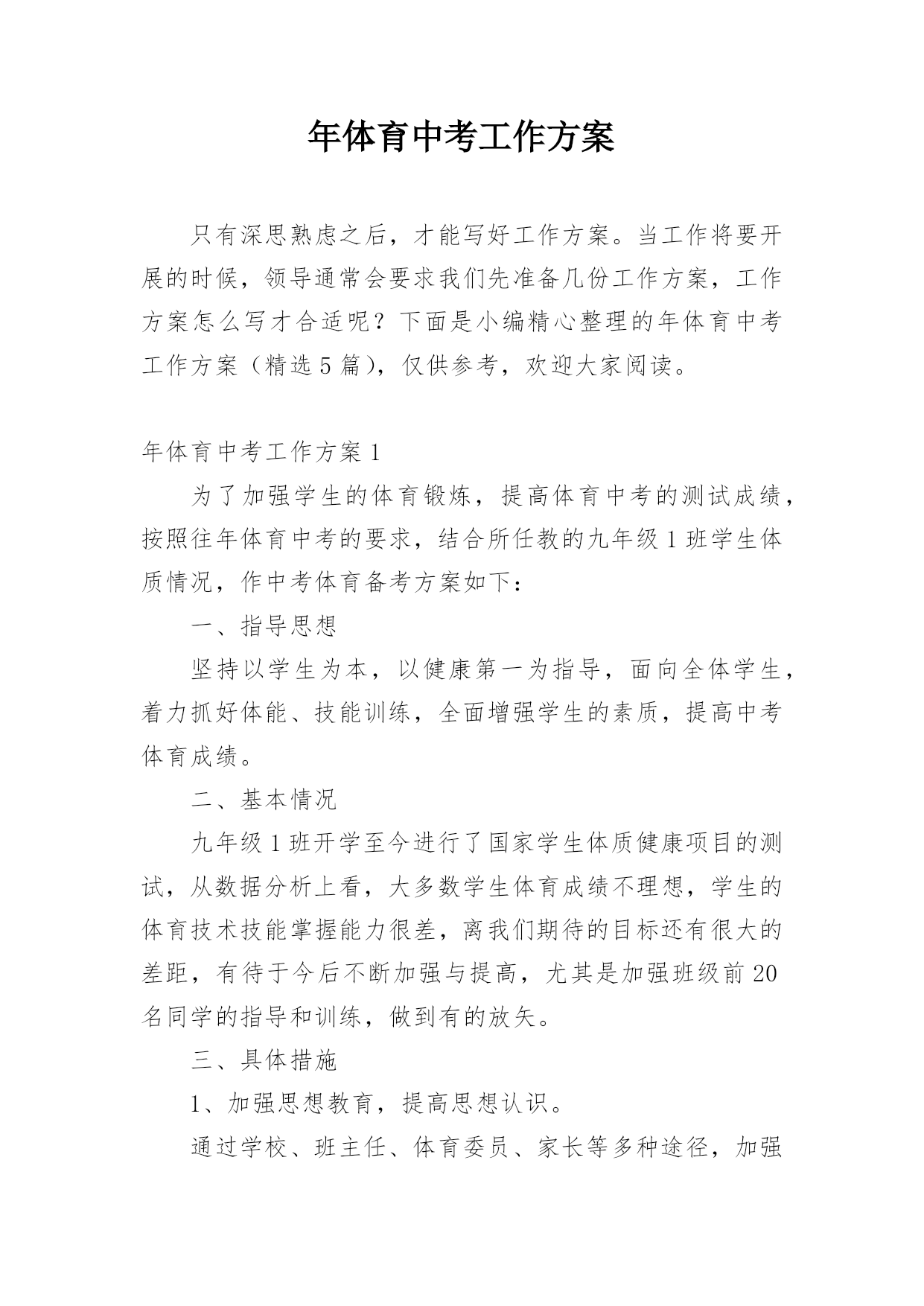 年体育中考工作方案只有深思熟虑之后,才能写好工作方案。当工作将要开展的时候,领导通常会要求我们先准备几份工作方案,工作方案怎么写才合适呢?下面是小编精心整理的年体育中考工作方案(精选5篇),仅供参考,欢迎大家阅读。年体育中考工作方案1为了加强学生的体育锻炼,提高体育中考的测试成绩,按照往年体育中考的要求,结合所任教的九年级1班学生体质情况,作中考体育备考方案如下:一、指导思想坚持以学生为本,以健康第一为指导,面向全体学生,着力抓好体能、技能训练,全面增强学生的素质,提高中考体育成绩。二、基本情况九年级1班