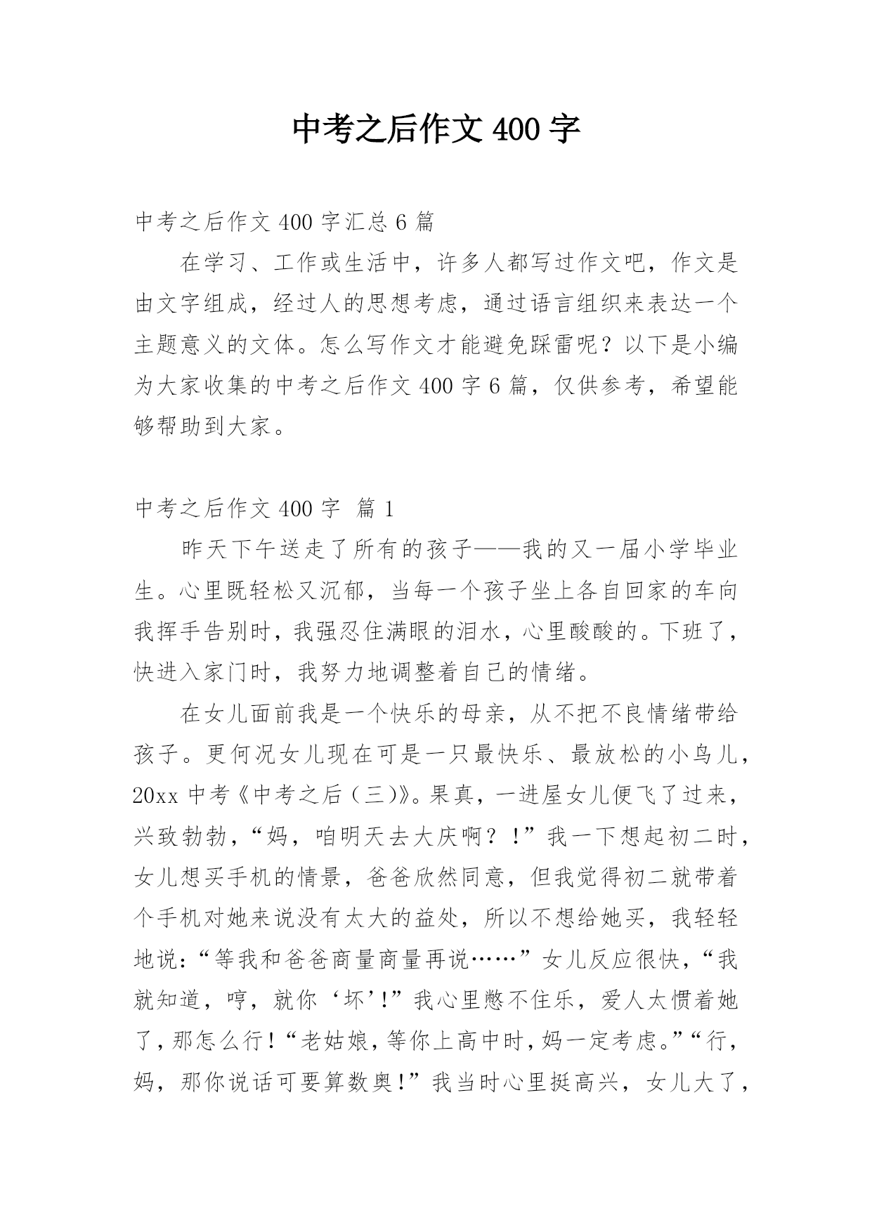 中考之后作文400字中考之后作文400字汇总6篇在学习、工作或生活中,许多人都写过作文吧,作文是由文字组成,经过人的思想考虑,通过语言组织来表达一个主题意义的文体。怎么写作文才能避免踩雷呢?以下是小编为大家收集的中考之后作文400字6篇,仅供参考,希望能够帮助到大家。中考之后作文400字篇1昨天下午送走了所有的孩子——我的又一届小学毕业生。心里既轻松又沉郁,当每一个孩子坐上各自回家的车向我挥手告别时,我强忍住满眼的泪水,心里酸酸的。下班了,快进入家门时,我努力地调整着自己的情绪。在女儿面前我是一个快乐的母