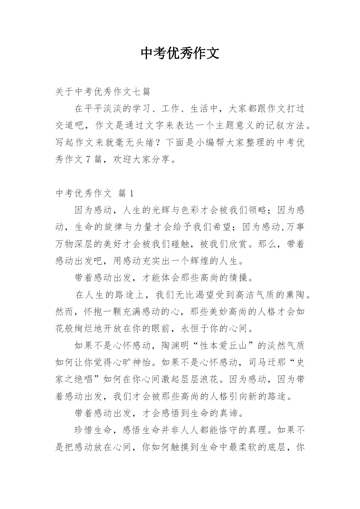 中考优秀作文关于中考优秀作文七篇在平平淡淡的学习、工作、生活中,大家都跟作文打过交道吧,作文是通过文字来表达一个主题意义的记叙方法。写起作文来就毫无头绪?下面是小编帮大家整理的中考优秀作文7篇,欢迎大家分享。中考优秀作文篇1因为感动,人生的光辉与色彩才会被我们领略;因为感动,生命的旋律与力量才会给予我们希望;因为感动,万事万物深层的美好才会被我们碰触,被我们欣赏。那么,带着感动出发吧,用感动充实出一个辉煌的人生。带着感动出发,才能体会那些高尚的情操。在人生的路途上,我们无比渴望受到高洁气质的熏陶。然而,怀