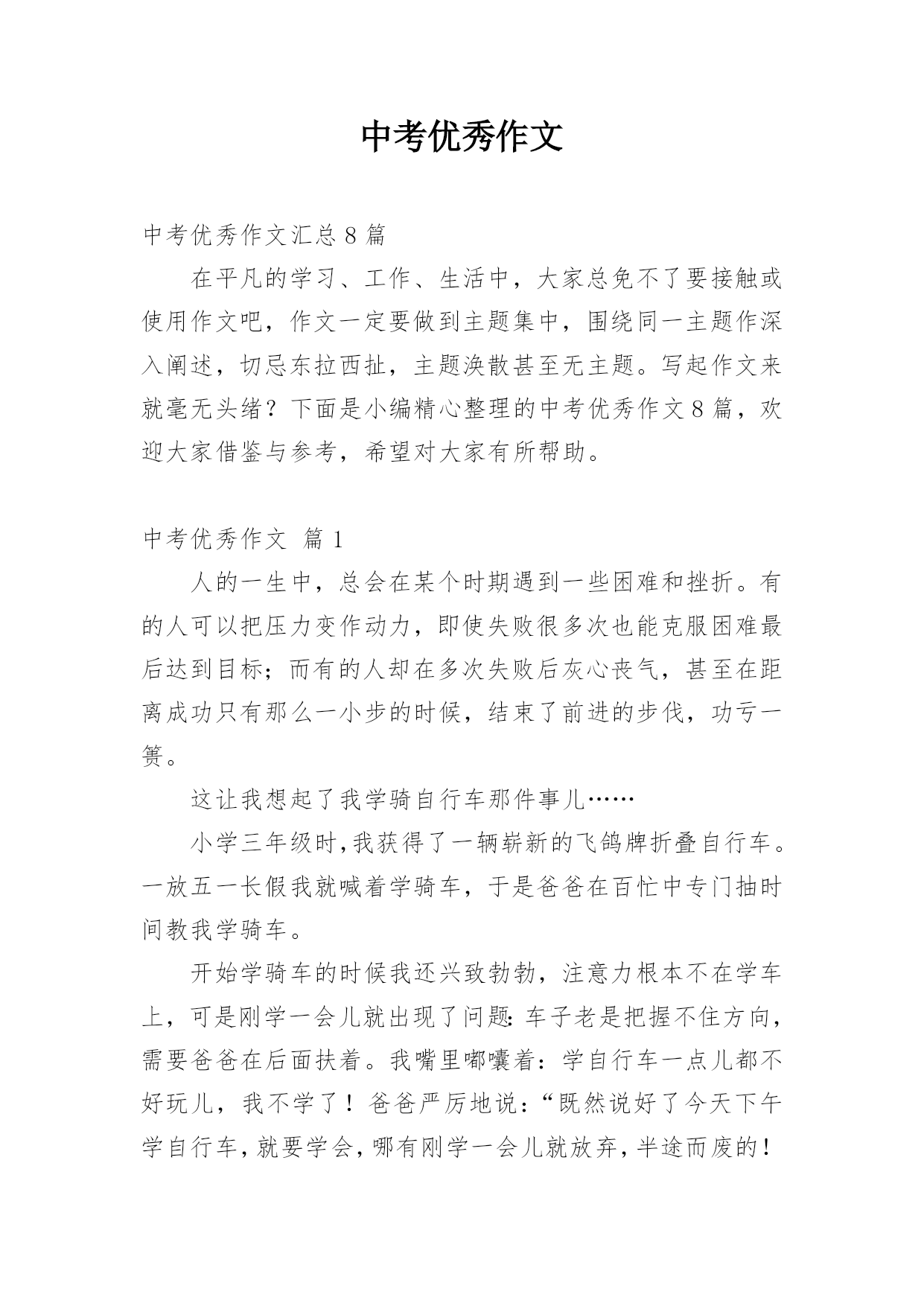 中考优秀作文中考优秀作文汇总8篇在平凡的学习、工作、生活中,大家总免不了要接触或使用作文吧,作文一定要做到主题集中,围绕同一主题作深入阐述,切忌东拉西扯,主题涣散甚至无主题。写起作文来就毫无头绪?下面是小编精心整理的中考优秀作文8篇,欢迎大家借鉴与参考,希望对大家有所帮助。中考优秀作文篇1人的一生中,总会在某个时期遇到一些困难和挫折。有的人可以把压力变作动力,即使失败很多次也能克服困难最后达到目标;而有的人却在多次失败后灰心丧气,甚至在距离成功只有那么一小步的时候,结束了前进的步伐,功亏一篑。这让我想起了