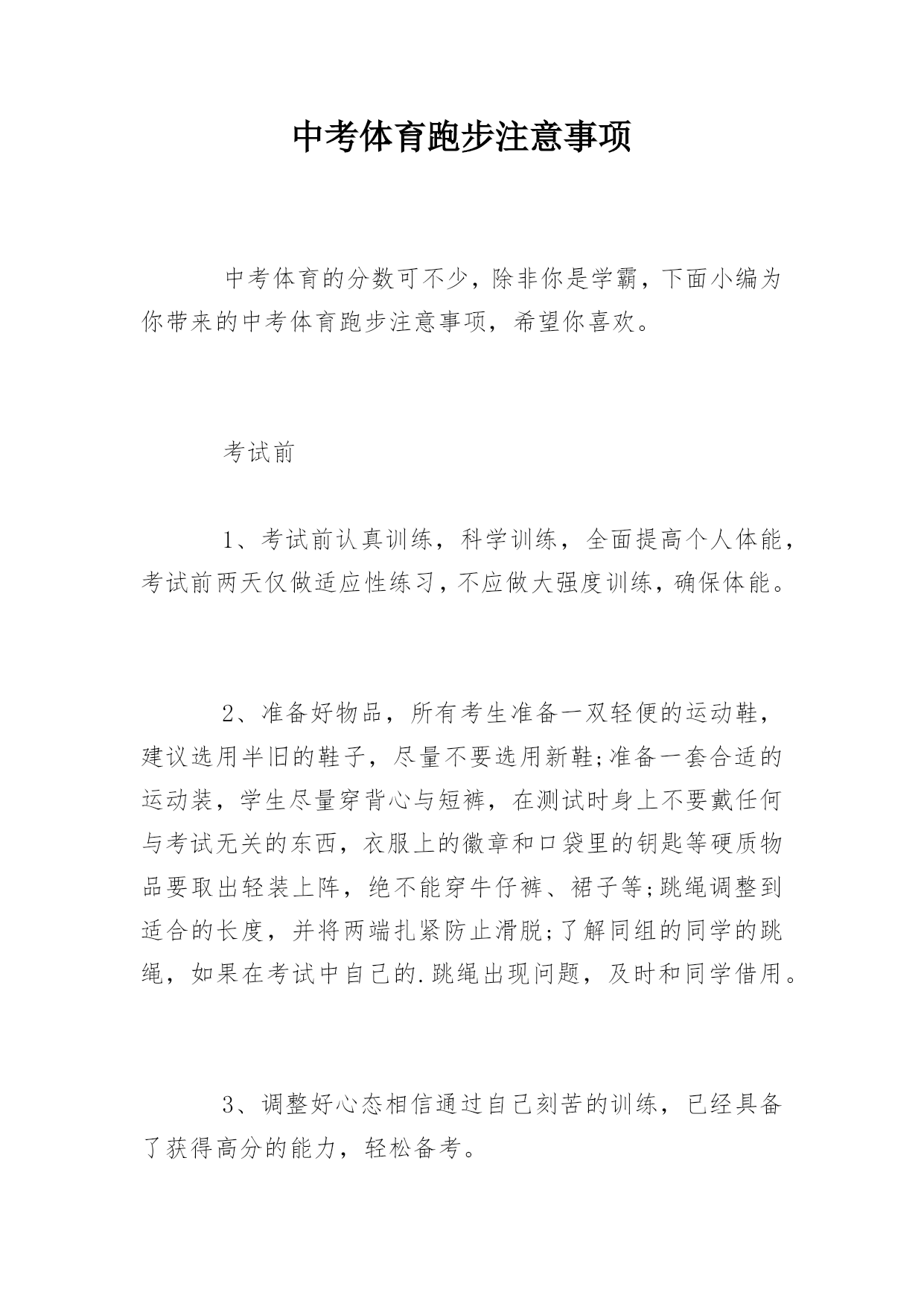 中考体育跑步注意事项中考体育的分数可不少,除非你是学霸,下面小编为你带来的中考体育跑步注意事项,希望你喜欢。考试前1、考试前认真训练,科学训练,全面提高个人体能,考试前两天仅做适应性练习,不应做大强度训练,确保体能。2、准备好物品,所有考生准备一双轻便的运动鞋,建议选用半旧的鞋子,尽量不要选用新鞋;准备一套合适的运动装,学生尽量穿背心与短裤,在测试时身上不要戴任何与考试无关的东西,衣服上的徽章和口袋里的钥匙等硬质物品要取出轻装上阵,绝不能穿牛仔裤、裙子等;跳绳调整到适合的长度,并将两端扎紧防止滑脱;了解同