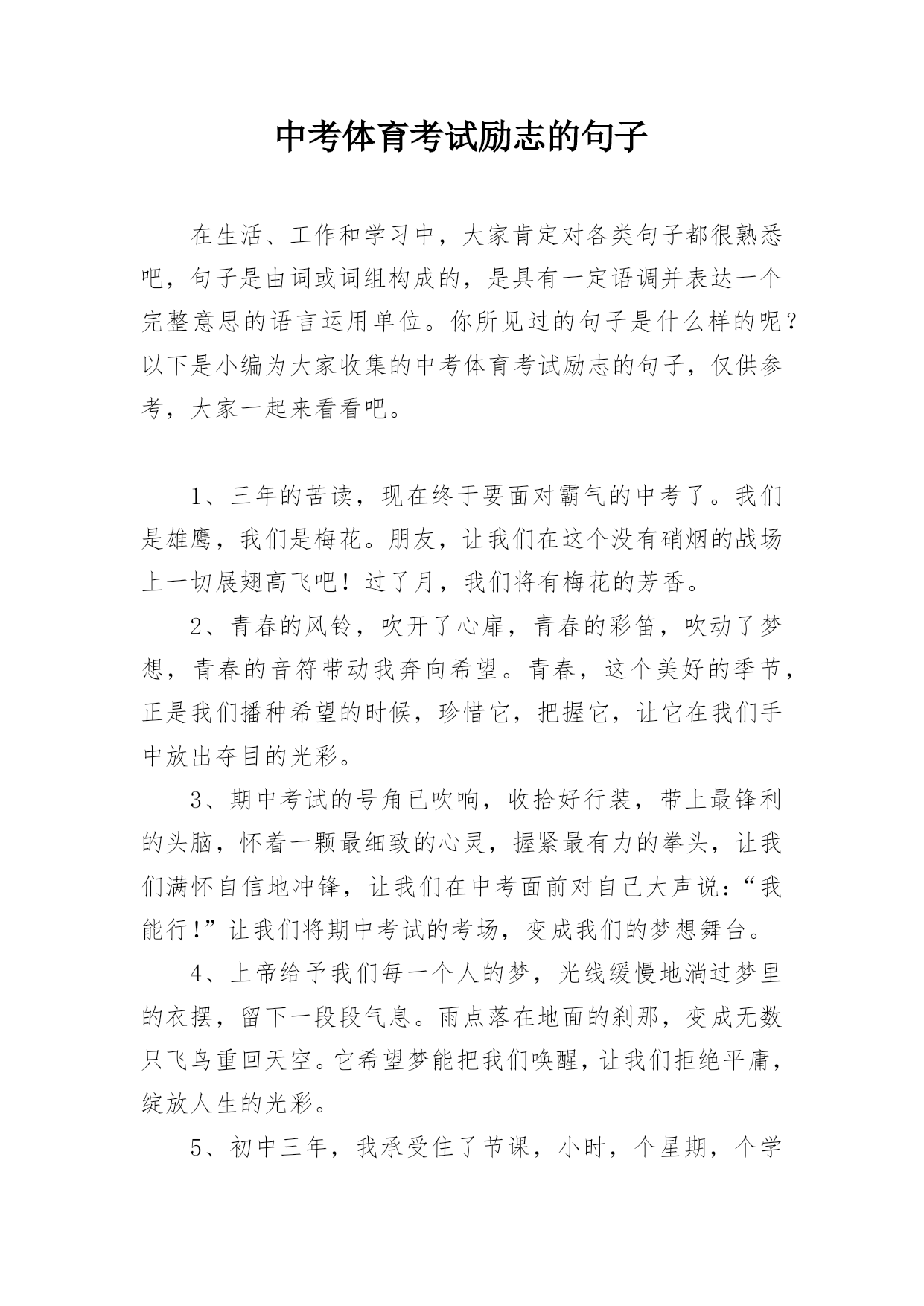 中考体育考试励志的句子在生活、工作和学习中,大家肯定对各类句子都很熟悉吧,句子是由词或词组构成的,是具有一定语调并表达一个完整意思的语言运用单位。你所见过的句子是什么样的呢?以下是小编为大家收集的中考体育考试励志的句子,仅供参考,大家一起来看看吧。1、三年的苦读,现在终于要面对霸气的中考了。我们是雄鹰,我们是梅花。朋友,让我们在这个没有硝烟的战场上一切展翅高飞吧!过了月,我们将有梅花的芳香。2、青春的风铃,吹开了心扉,青春的彩笛,吹动了梦想,青春的音符带动我奔向希望。青春,这个美好的季节,正是我们播种希望