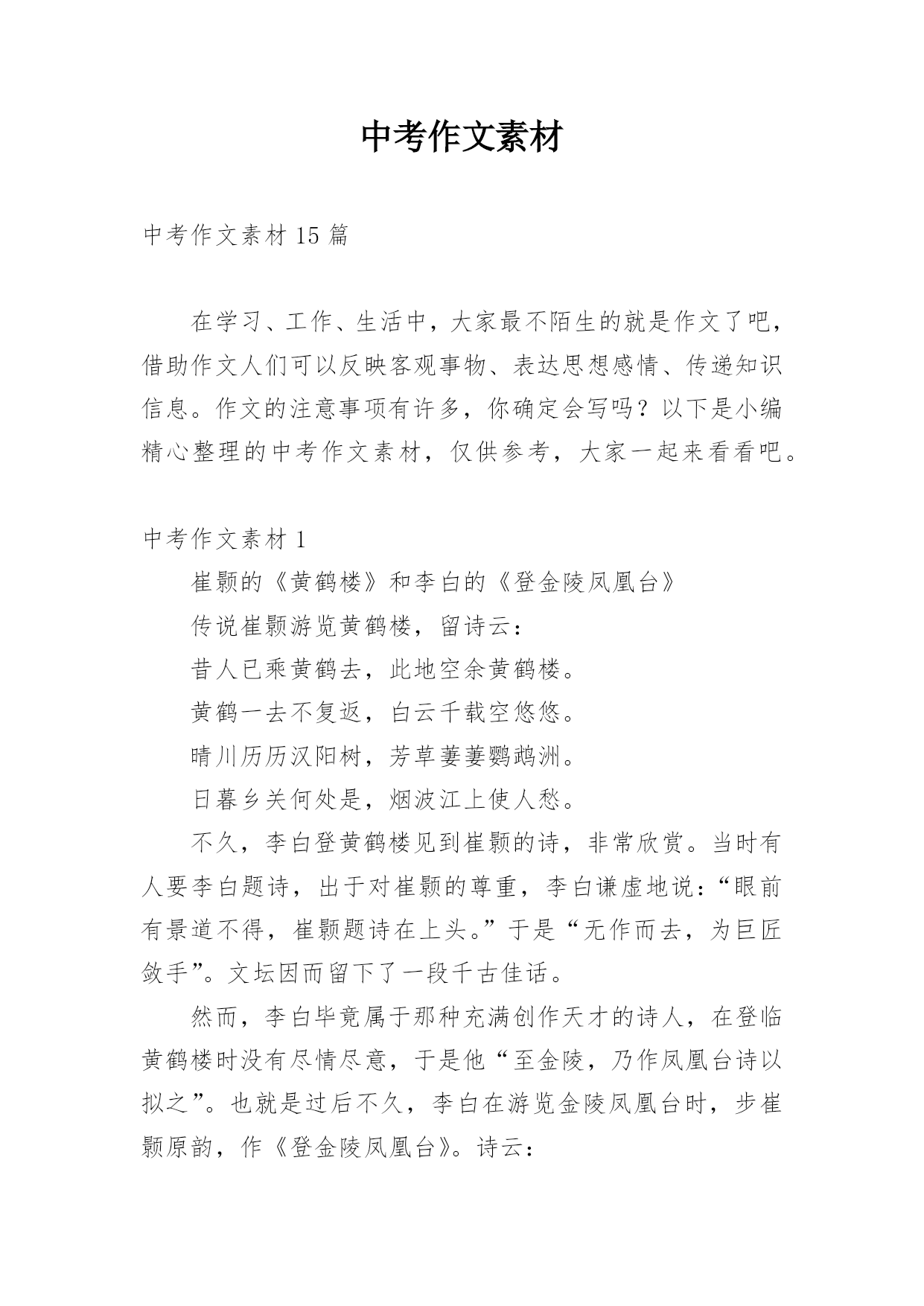 中考作文素材中考作文素材15篇在学习、工作、生活中,大家最不陌生的就是作文了吧,借助作文人们可以反映客观事物、表达思想感情、传递知识信息。作文的注意事项有许多,你确定会写吗?以下是小编精心整理的中考作文素材,仅供参考,大家一起来看看吧。中考作文素材1崔颢的《黄鹤楼》和李白的《登金陵凤凰台》传说崔颢游览黄鹤楼,留诗云:昔人已乘黄鹤去,此地空余黄鹤楼。黄鹤一去不复返,白云千载空悠悠。晴川历历汉阳树,芳草萋萋鹦鹉洲。日暮乡关何处是,烟波江上使人愁。不久,李白登黄鹤楼见到崔颢的诗,非常欣赏。当时有人要李白题诗,出