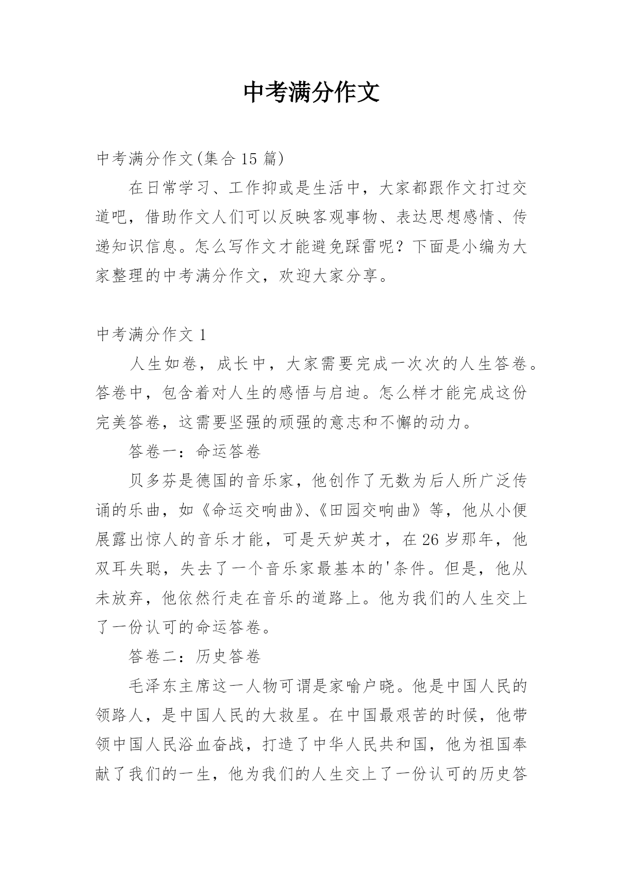 中考满分作文中考满分作文(集合15篇)在日常学习、工作抑或是生活中,大家都跟作文打过交道吧,借助作文人们可以反映客观事物、表达思想感情、传递知识信息。怎么写作文才能避免踩雷呢?下面是小编为大家整理的中考满分作文,欢迎大家分享。中考满分作文1人生如卷,成长中,大家需要完成一次次的人生答卷。答卷中,包含着对人生的感悟与启迪。怎么样才能完成这份完美答卷,这需要坚强的顽强的意志和不懈的动力。答卷一:命运答卷贝多芬是德国的音乐家,他创作了无数为后人所广泛传诵的乐曲,如《命运交响曲》、《田园交响曲》等,他从小便展露出