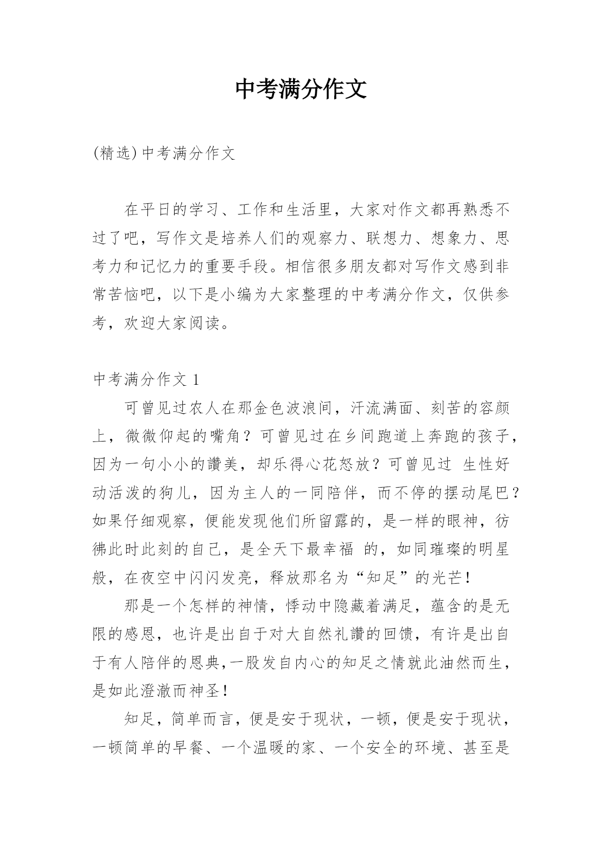 中考满分作文(精选)中考满分作文在平日的学习、工作和生活里,大家对作文都再熟悉不过了吧,写作文是培养人们的观察力、联想力、想象力、思考力和记忆力的重要手段。相信很多朋友都对写作文感到非常苦恼吧,以下是小编为大家整理的中考满分作文,仅供参考,欢迎大家阅读。中考满分作文1可曾见过农人在那金色波浪间,汗流满面、刻苦的容颜上,微微仰起的嘴角?可曾见过在乡间跑道上奔跑的孩子,因为一句小小的讚美,却乐得心花怒放?可曾见过生性好动活泼的狗儿,因为主人的一同陪伴,而不停的摆动尾巴?如果仔细观察,便能发现他们所留露的,是一
