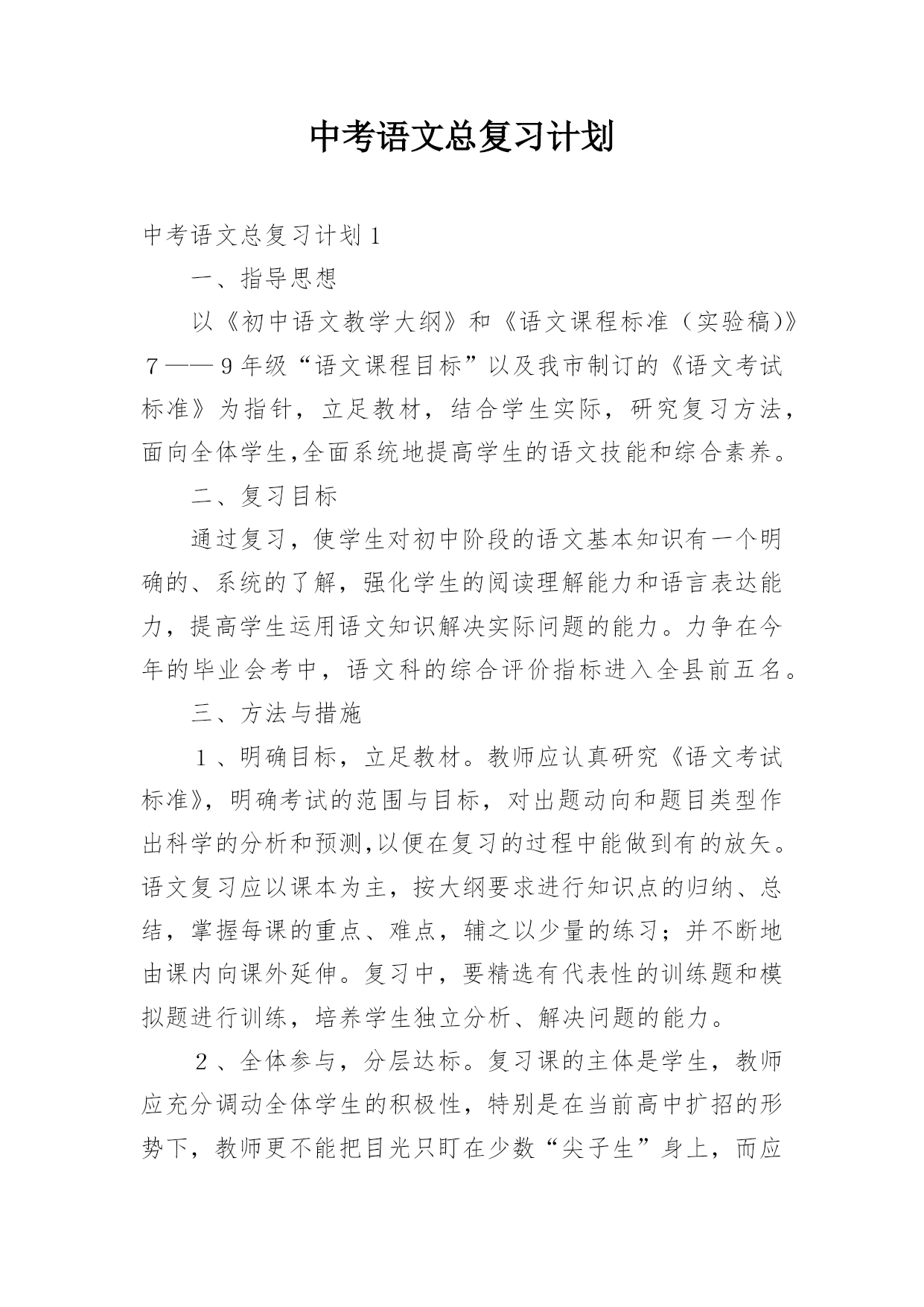 中考语文总复习计划中考语文总复习计划1一、指导思想以《初中语文教学大纲》和《语文课程标准(实验稿)》7——9年级“语文课程目标”以及我市制订的《语文考试标准》为指针,立足教材,结合学生实际,研究复习方法,面向全体学生,全面系统地提高学生的语文技能和综合素养。二、复习目标通过复习,使学生对初中阶段的语文基本知识有一个明确的、系统的了解,强化学生的阅读理解能力和语言表达能力,提高学生运用语文知识解决实际问题的能力。力争在今年的毕业会考中,语文科的综合评价指标进入全县前五名。三、方法与措施1、明确目标,立足教材