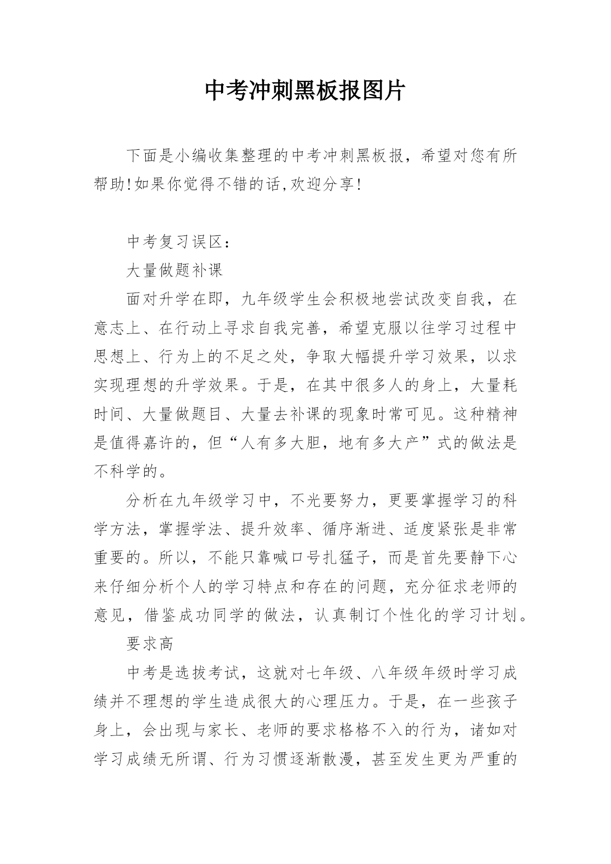中考冲刺黑板报图片下面是小编收集整理的中考冲刺黑板报,希望对您有所帮助!如果你觉得不错的话,欢迎分享!中考复习误区:大量做题补课面对升学在即,九年级学生会积极地尝试改变自我,在意志上、在行动上寻求自我完善,希望克服以往学习过程中思想上、行为上的不足之处,争取大幅提升学习效果,以求实现理想的升学效果。于是,在其中很多人的身上,大量耗时间、大量做题目、大量去补课的现象时常可见。这种精神是值得嘉许的,但“人有多大胆,地有多大产”式的做法是不科学的。分析在九年级学习中,不光要努力,更要掌握学习的科学方法,掌握学法