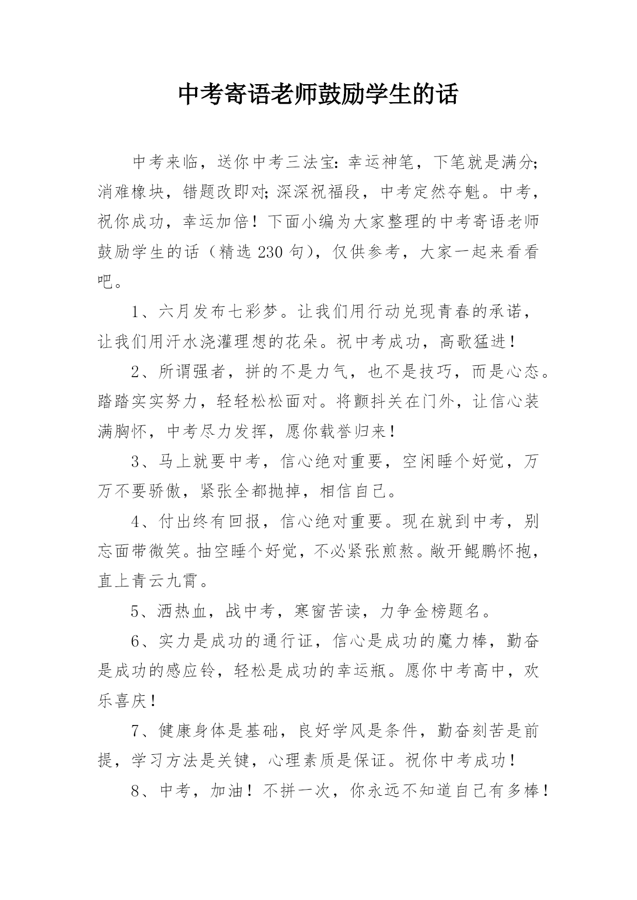 中考寄语老师鼓励学生的话中考来临,送你中考三法宝:幸运神笔,下笔就是满分;消难橡块,错题改即对;深深祝福段,中考定然夺魁。中考,祝你成功,幸运加倍!下面小编为大家整理的中考寄语老师鼓励学生的话(精选230句),仅供参考,大家一起来看看吧。1、六月发布七彩梦。让我们用行动兑现青春的承诺,让我们用汗水浇灌理想的花朵。祝中考成功,高歌猛进!2、所谓强者,拼的不是力气,也不是技巧,而是心态。踏踏实实努力,轻轻松松面对。将颤抖关在门外,让信心装满胸怀,中考尽力发挥,愿你载誉归来!3、马上就要中考,信心绝对重要,空闲