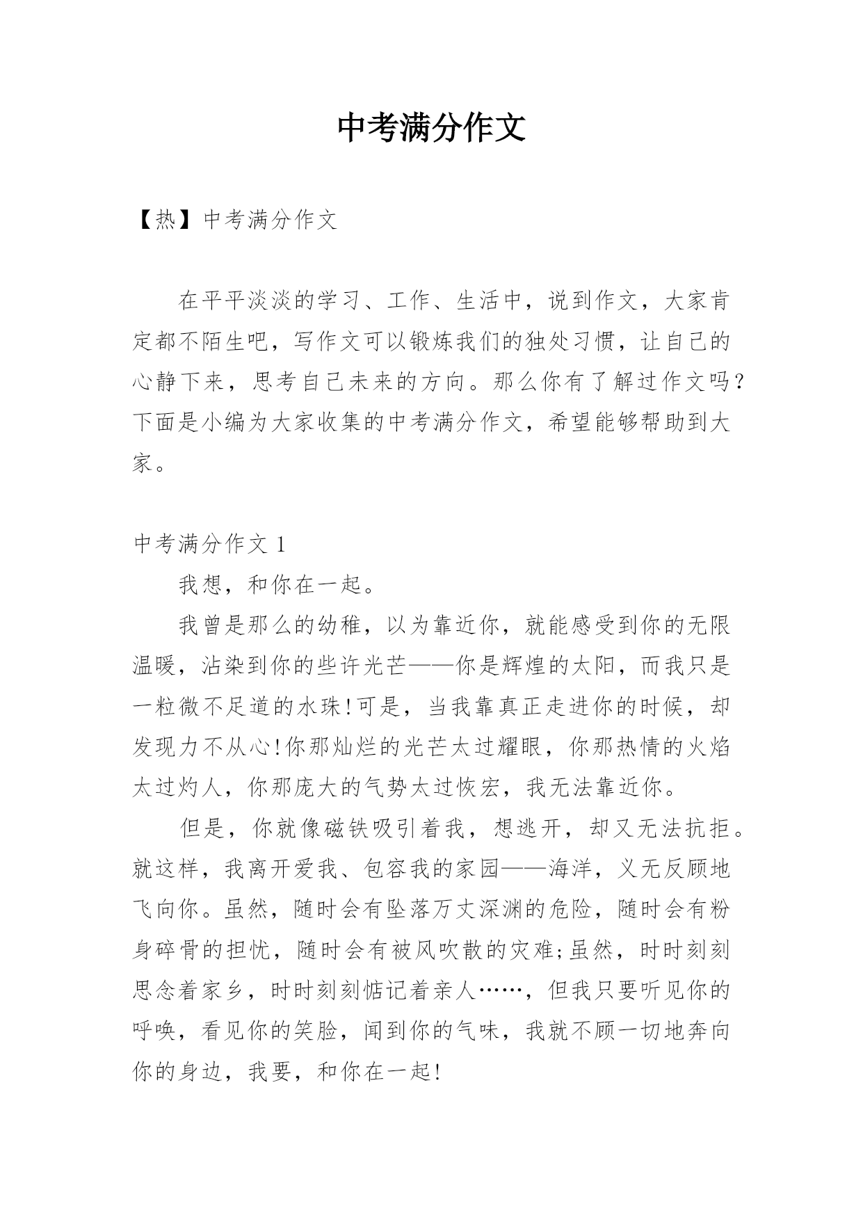 中考满分作文【热】中考满分作文在平平淡淡的学习、工作、生活中,说到作文,大家肯定都不陌生吧,写作文可以锻炼我们的独处习惯,让自己的心静下来,思考自己未来的方向。那么你有了解过作文吗?下面是小编为大家收集的中考满分作文,希望能够帮助到大家。中考满分作文1我想,和你在一起。我曾是那么的幼稚,以为靠近你,就能感受到你的无限温暖,沾染到你的些许光芒——你是辉煌的太阳,而我只是一粒微不足道的水珠!可是,当我靠真正走进你的时候,却发现力不从心!你那灿烂的光芒太过耀眼,你那热情的火焰太过灼人,你那庞大的气势太过恢宏,我