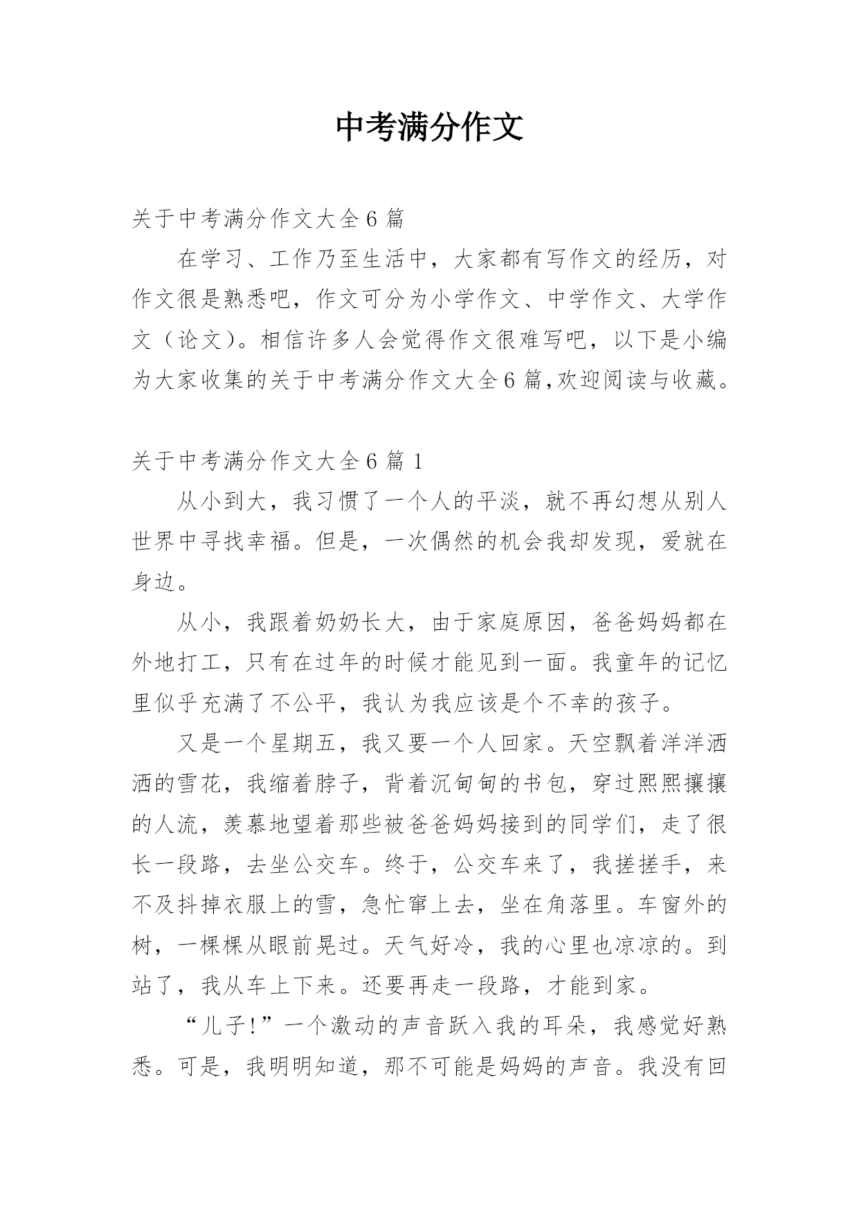 中考满分作文关于中考满分作文大全6篇在学习、工作乃至生活中,大家都有写作文的经历,对作文很是熟悉吧,作文可分为小学作文、中学作文、大学作文(论文)。相信许多人会觉得作文很难写吧,以下是小编为大家收集的关于中考满分作文大全6篇,欢迎阅读与收藏。关于中考满分作文大全6篇1从小到大,我习惯了一个人的平淡,就不再幻想从别人世界中寻找幸福。但是,一次偶然的机会我却发现,爱就在身边。从小,我跟着奶奶长大,由于家庭原因,爸爸妈妈都在外地打工,只有在过年的时候才能见到一面。我童年的记忆里似乎充满了不公平,我认为我应该是个