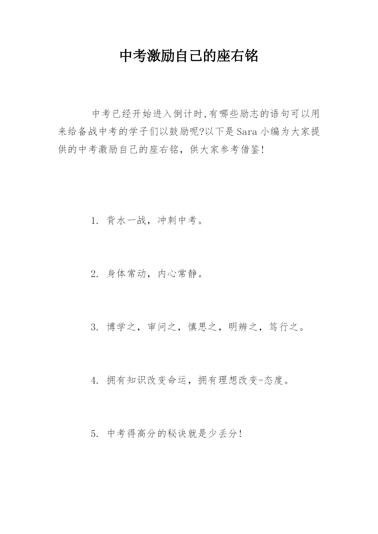 中考激励自己的座右铭中考已经开始进入倒计时,有哪些励志的语句可以用来给备战中考的学子们以鼓励呢?以下是Sara小编为大家提供的中考激励自己的座右铭,供大家参考借鉴!1.背水一战,冲刺中考。2.身体常动,内心常静。3.博学之,审问之,慎思之,明辨之,笃行之。4.拥有知识改变命运,拥有理想改变-态度。5.中考得高分的秘诀就是少丢分!6.把汗水变成珍珠,把梦想变成现实!7.心无旁鹜志在必得8.十年一博六月梦,赢得寒窗锦绣程。9.不思,故无惑;不求,故无得;不问,故无知。10.既然选择了远方,便只顾风雨兼程。11