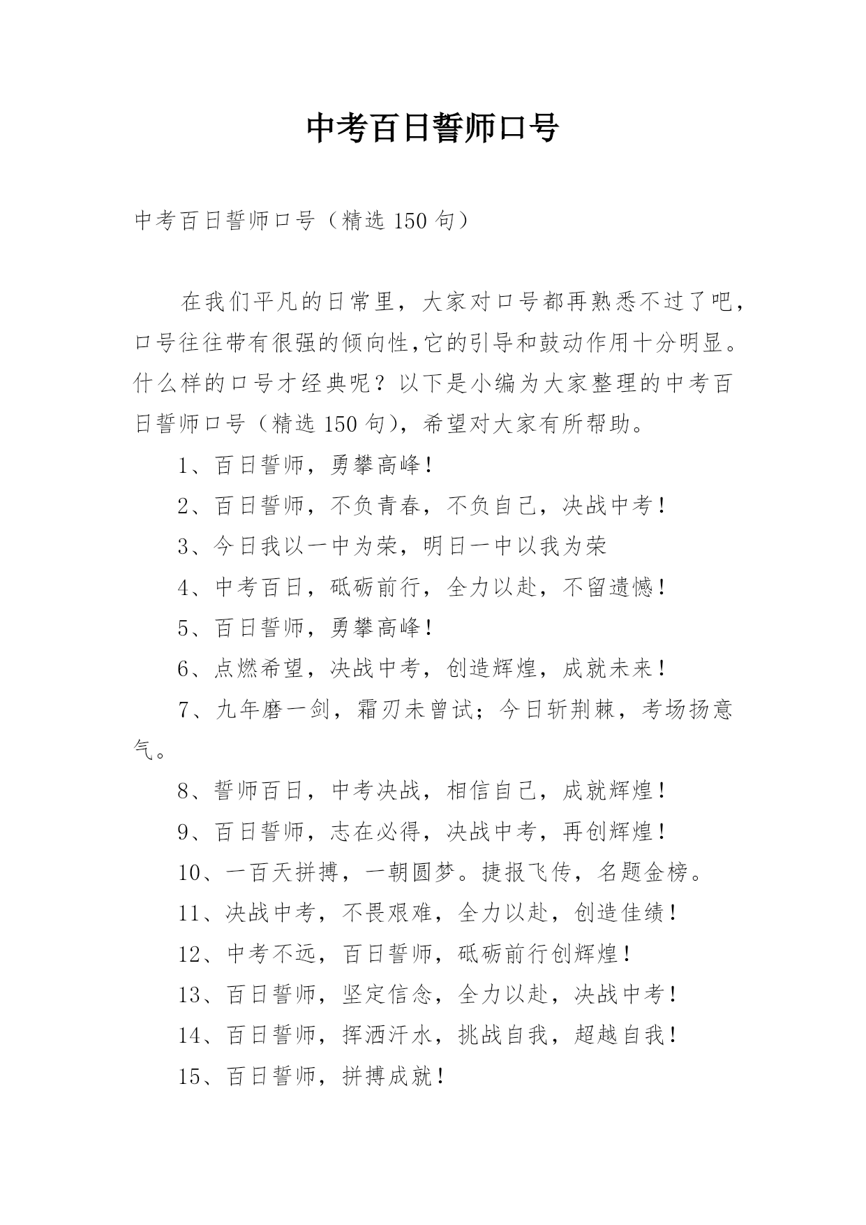 中考百日誓师口号中考百日誓师口号(精选150句)在我们平凡的日常里,大家对口号都再熟悉不过了吧,口号往往带有很强的倾向性,它的引导和鼓动作用十分明显。什么样的口号才经典呢?以下是小编为大家整理的中考百日誓师口号(精选150句),希望对大家有所帮助。1、百日誓师,勇攀高峰!2、百日誓师,不负青春,不负自己,决战中考!3、今日我以一中为荣,明日一中以我为荣4、中考百日,砥砺前行,全力以赴,不留遗憾!5、百日誓师,勇攀高峰!6、点燃希望,决战中考,创造辉煌,成就未来!7、九年磨一剑,霜刃未曾试;今日斩荆棘,考场
