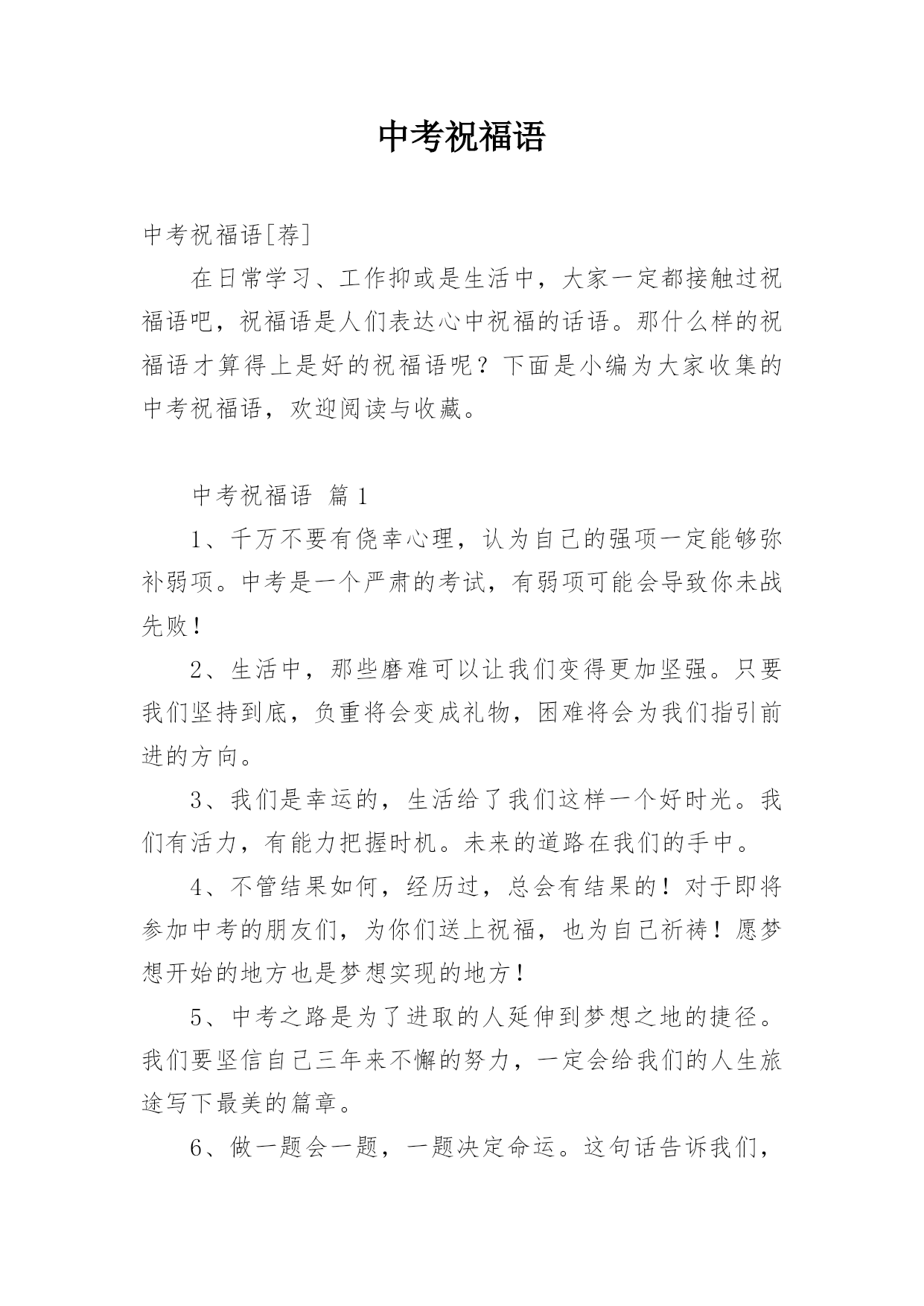 中考祝福语中考祝福语[荐]在日常学习、工作抑或是生活中,大家一定都接触过祝福语吧,祝福语是人们表达心中祝福的话语。那什么样的祝福语才算得上是好的祝福语呢?下面是小编为大家收集的中考祝福语,欢迎阅读与收藏。中考祝福语篇11、千万不要有侥幸心理,认为自己的强项一定能够弥补弱项。中考是一个严肃的考试,有弱项可能会导致你未战先败!2、生活中,那些磨难可以让我们变得更加坚强。只要我们坚持到底,负重将会变成礼物,困难将会为我们指引前进的方向。3、我们是幸运的,生活给了我们这样一个好时光。我们有活力,有能力把握时机。未