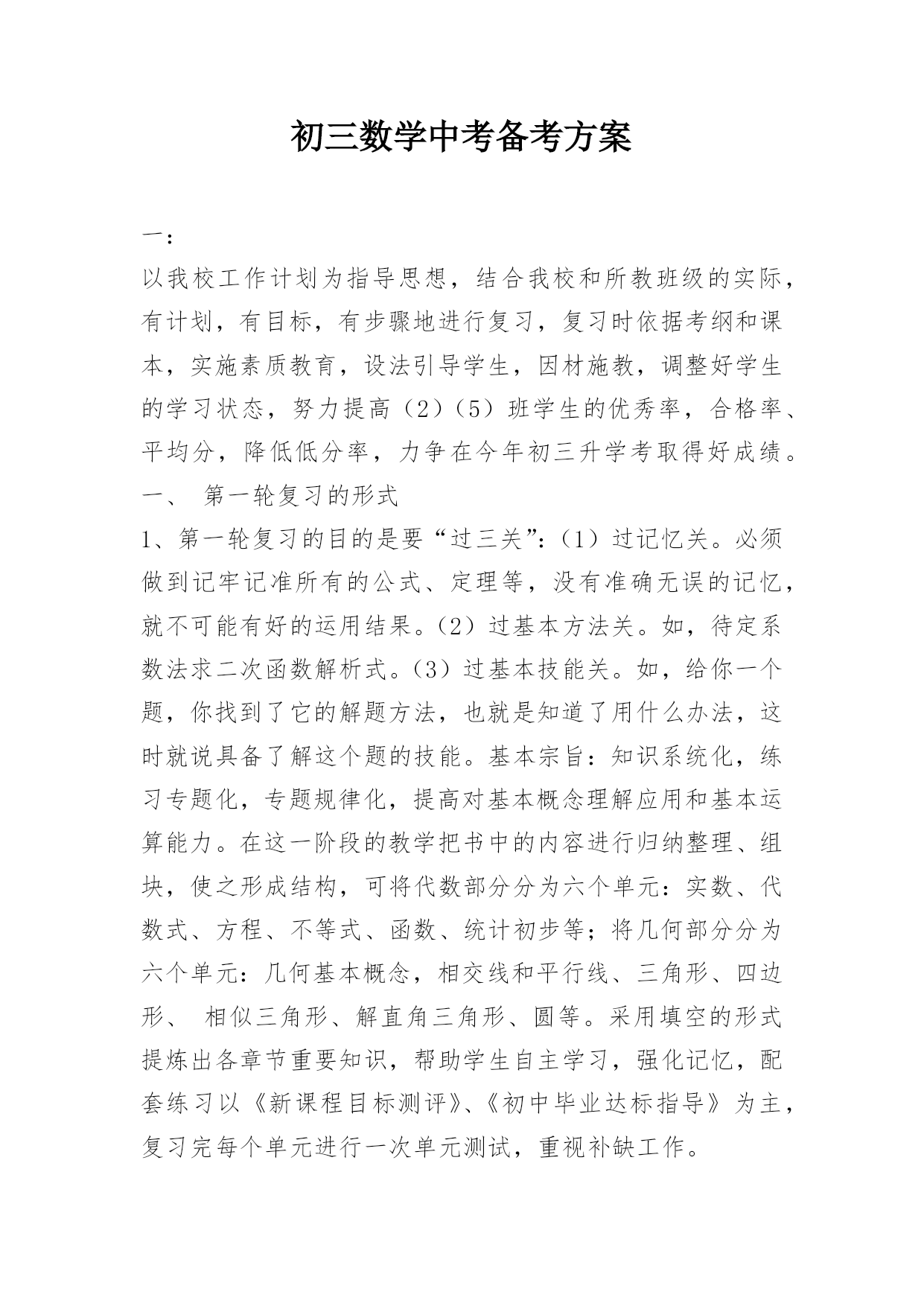 初三数学中考备考方案一:以我校工作计划为指导思想,结合我校和所教班级的实际,有计划,有目标,有步骤地进行复习,复习时依据考纲和课本,实施素质教育,设法引导学生,因材施教,调整好学生的学习状态,努力提高(2)(5)班学生的优秀率,合格率、平均分,降低低分率,力争在今年初三升学考取得好成绩。一、第一轮复习的形式1、第一轮复习的目的是要“过三关”:(1)过记忆关。必须做到记牢记准所有的公式、定理等,没有准确无误的记忆,就不可能有好的运用结果。(2)过基本方法关。如,待定系数法求二次函数解析式。(3)过基本技能关