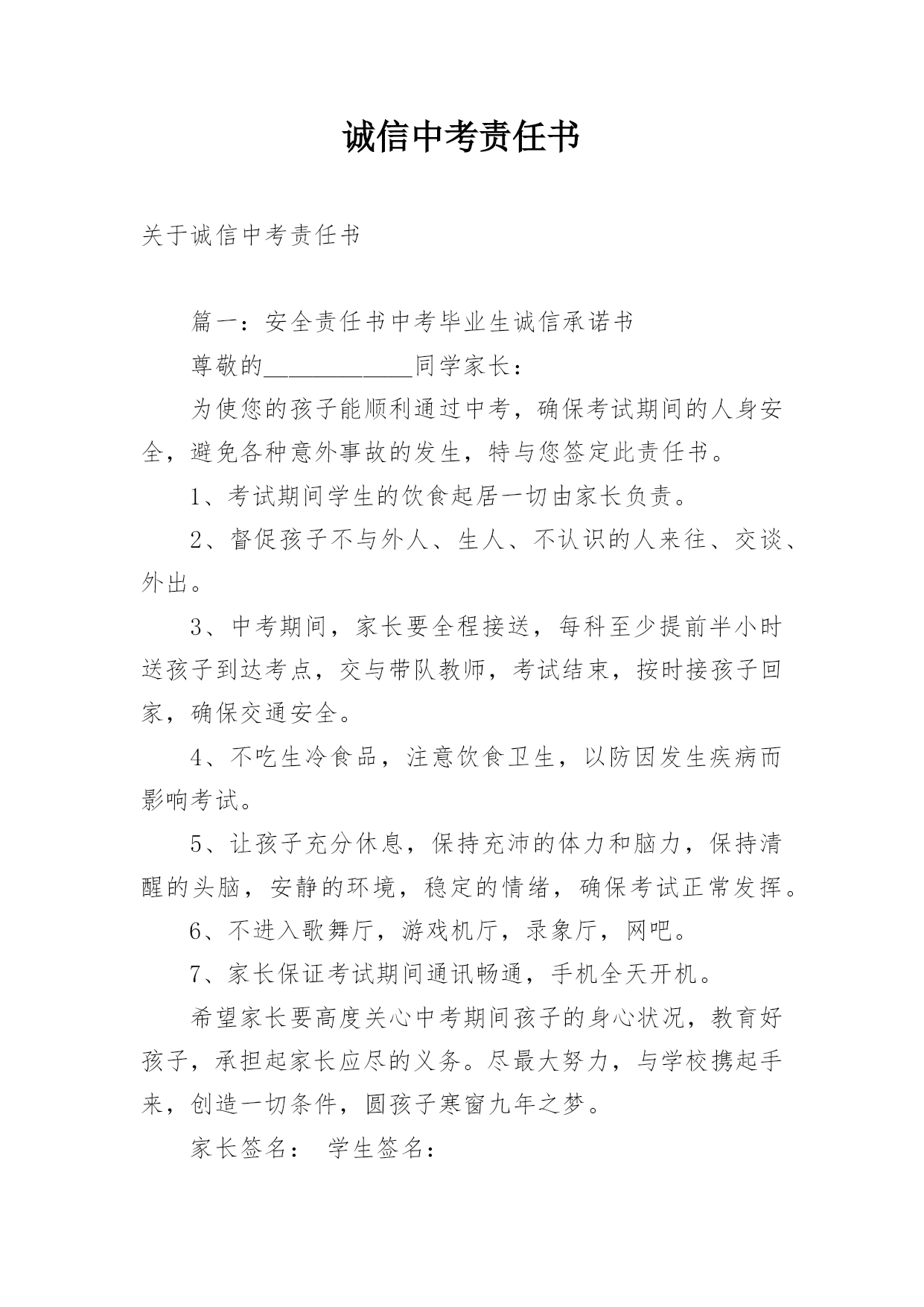 诚信中考责任书关于诚信中考责任书篇一:安全责任书中考毕业生诚信承诺书尊敬的______同学家长:为使您的孩子能顺利通过中考,确保考试期间的人身安全,避免各种意外事故的发生,特与您签定此责任书。1、考试期间学生的饮食起居一切由家长负责。2、督促孩子不与外人、生人、不认识的人来往、交谈、外出。3、中考期间,家长要全程接送,每科至少提前半小时送孩子到达考点,交与带队教师,考试结束,按时接孩子回家,确保交通安全。4、不吃生冷食品,注意饮食卫生,以防因发生疾病而影响考试。5、让孩子充分休息,保持充沛的体力和脑力,保
