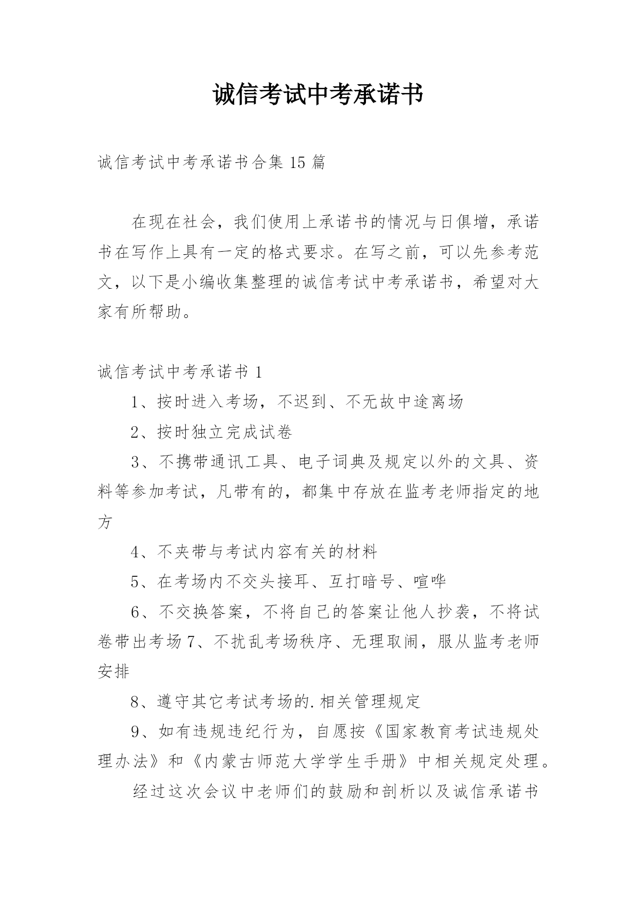诚信考试中考承诺书诚信考试中考承诺书合集15篇在现在社会,我们使用上承诺书的情况与日俱增,承诺书在写作上具有一定的格式要求。在写之前,可以先参考范文,以下是小编收集整理的诚信考试中考承诺书,希望对大家有所帮助。诚信考试中考承诺书11、按时进入考场,不迟到、不无故中途离场2、按时独立完成试卷3、不携带通讯工具、电子词典及规定以外的文具、资料等参加考试,凡带有的,都集中存放在监考老师指定的地方4、不夹带与考试内容有关的材料5、在考场内不交头接耳、互打暗号、喧哗6、不交换答案,不将自己的答案让他人抄袭,不将试卷