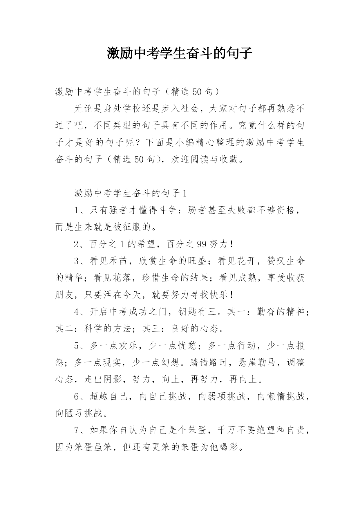 激励中考学生奋斗的句子激励中考学生奋斗的句子(精选50句)无论是身处学校还是步入社会,大家对句子都再熟悉不过了吧,不同类型的句子具有不同的作用。究竟什么样的句子才是好的句子呢?下面是小编精心整理的激励中考学生奋斗的句子(精选50句),欢迎阅读与收藏。激励中考学生奋斗的句子11、只有强者才懂得斗争;弱者甚至失败都不够资格,而是生来就是被征服的。2、百分之1的希望,百分之99努力!3、看见禾苗,欣赏生命的旺盛;看见花开,赞叹生命的精华;看见花落,珍惜生命的结果;看见成熟,享受收获朋友,只要活在今天,就要努力寻