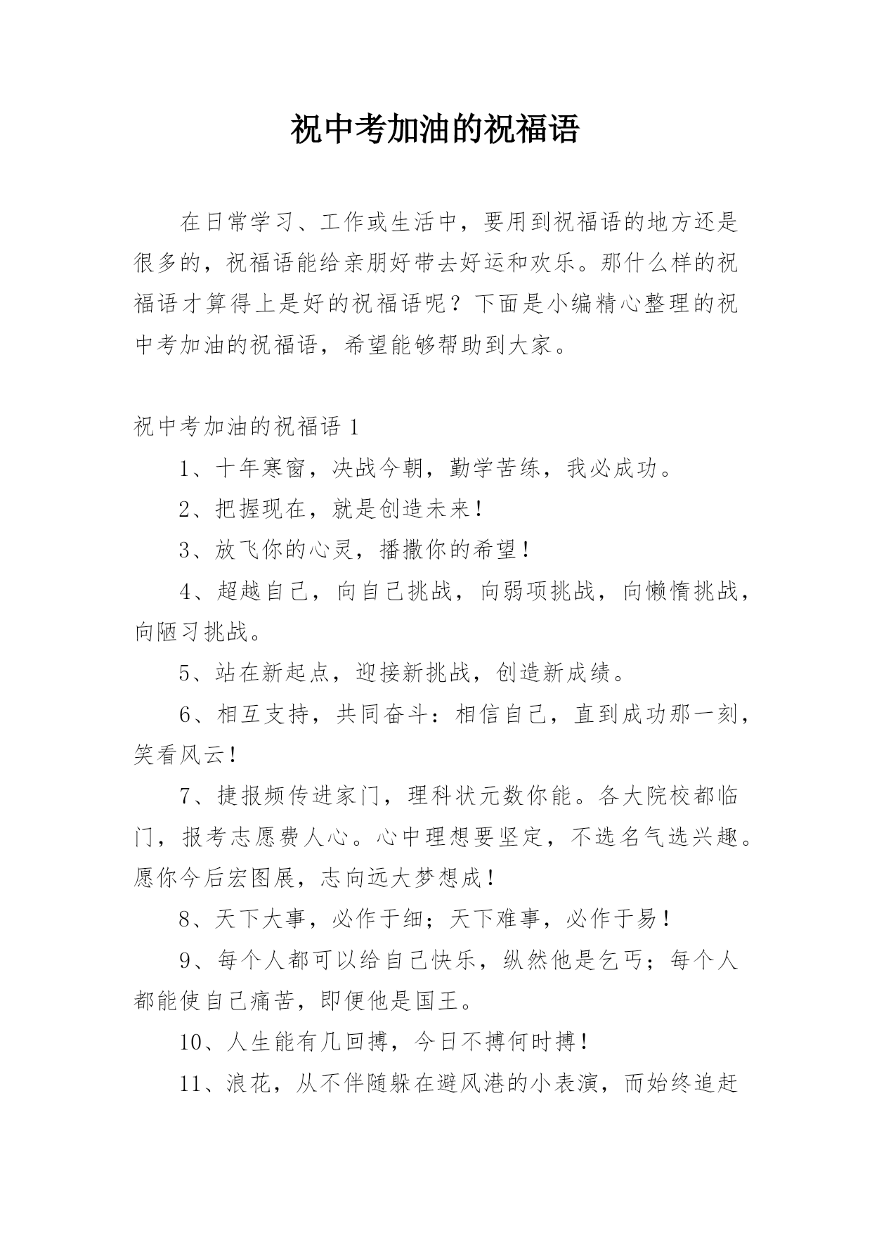 祝中考加油的祝福语在日常学习、工作或生活中,要用到祝福语的地方还是很多的,祝福语能给亲朋好带去好运和欢乐。那什么样的祝福语才算得上是好的祝福语呢?下面是小编精心整理的祝中考加油的祝福语,希望能够帮助到大家。祝中考加油的祝福语11、十年寒窗,决战今朝,勤学苦练,我必成功。2、把握现在,就是创造未来!3、放飞你的心灵,播撒你的希望!4、超越自己,向自己挑战,向弱项挑战,向懒惰挑战,向陋习挑战。5、站在新起点,迎接新挑战,创造新成绩。6、相互支持,共同奋斗:相信自己,直到成功那一刻,笑看风云!7、捷报频传进家门