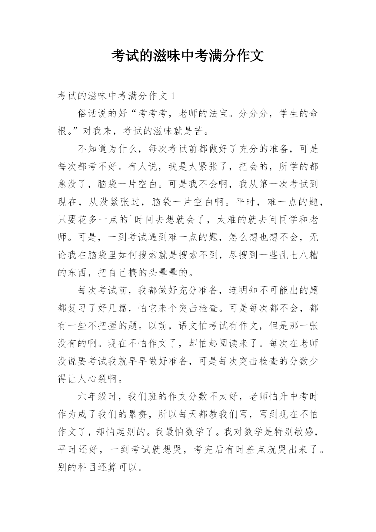 考试的滋味中考满分作文考试的滋味中考满分作文1俗话说的好“考考考,老师的法宝。分分分,学生的命根。”对我来,考试的滋味就是苦。不知道为什么,每次考试前都做好了充分的准备,可是每次都考不好。有人说,我是太紧张了,把会的,所学的都急没了,脑袋一片空白。可是我不会啊,我从第一次考试到现在,从没紧张过,脑袋一片空白啊。平时,难一点的题,只要花多一点的`时间去想就会了,太难的就去问同学和老师。可是,一到考试遇到难一点的题,怎么想也想不会,无论我在脑袋里如何搜索就是搜索不到,尽搜到一些乱七八糟的东西,把自己搞的头晕晕