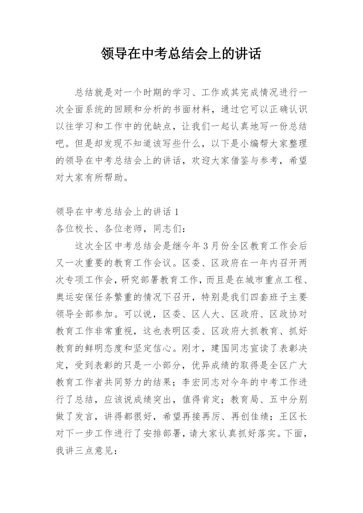 领导在中考总结会上的讲话总结就是对一个时期的学习、工作或其完成情况进行一次全面系统的回顾和分析的书面材料,通过它可以正确认识以往学习和工作中的优缺点,让我们一起认真地写一份总结吧。但是却发现不知道该写些什么,以下是小编帮大家整理的领导在中考总结会上的讲话,欢迎大家借鉴与参考,希望对大家有所帮助。领导在中考总结会上的讲话1各位校长、各位老师,同志们:这次全区中考总结会是继今年3月份全区教育工作会后又一次重要的教育工作会议。区委、区政府在一年内召开两次专项工作会,研究部署教育工作,而且是在城市重点工程、奥运安