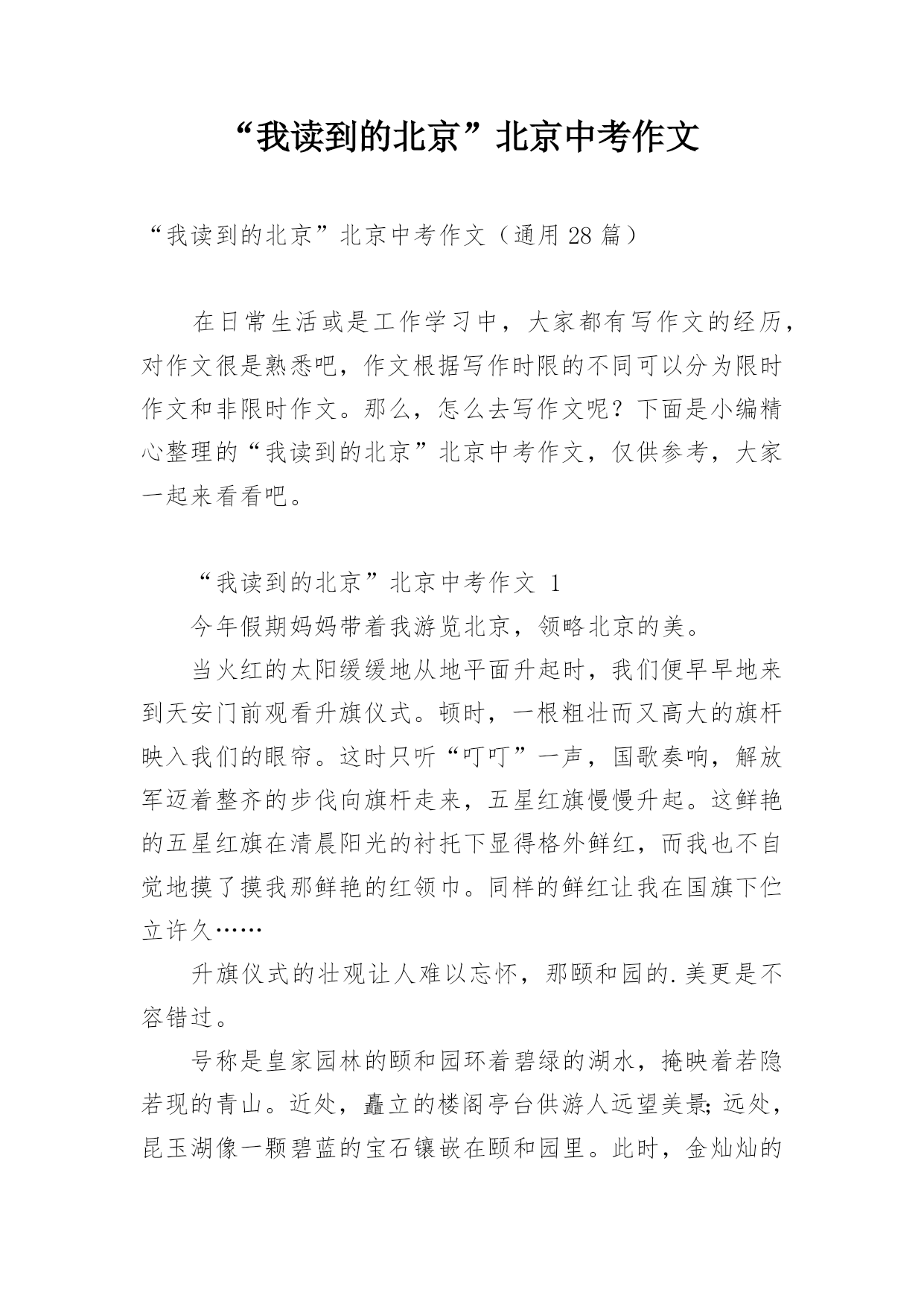 “我读到的北京”北京中考作文“我读到的北京”北京中考作文(通用28篇)在日常生活或是工作学习中,大家都有写作文的经历,对作文很是熟悉吧,作文根据写作时限的不同可以分为限时作文和非限时作文。那么,怎么去写作文呢?下面是小编精心整理的“我读到的北京”北京中考作文,仅供参考,大家一起来看看吧。“我读到的北京”北京中考作文1今年假期妈妈带着我游览北京,领略北京的美。当火红的太阳缓缓地从地平面升起时,我们便早早地来到天安门前观看升旗仪式。顿时,一根粗壮而又高大的旗杆映入我们的眼帘。这时只听“叮叮”一声,国歌奏响,解