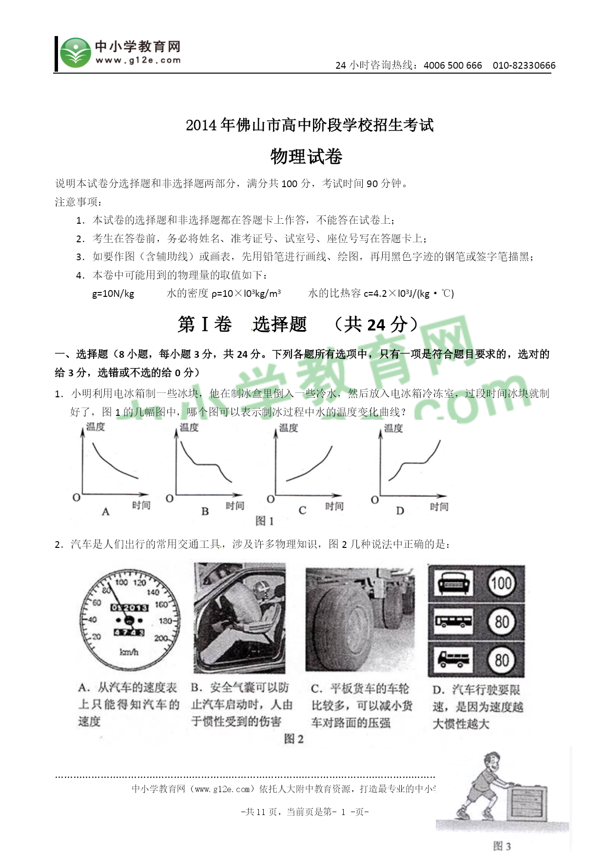 24小时咨询热线:4006500666010-82330666………………………………………………………………………………………………………………………………………………中小学教育网(www.g12e.com)依托人大附中教育资源,打造最专业的中小学辅导网站-共NUMPAGES11页,当前页是第PAGE-11-页-2014年佛山市高中阶段学校招生考试物理试卷说明本试卷分选择题和非选择题两部分,满分共100分,考试时间90分钟。注意事项:1.本试卷的选择题和非选择题都在答题卡上作答,不能答在试卷
