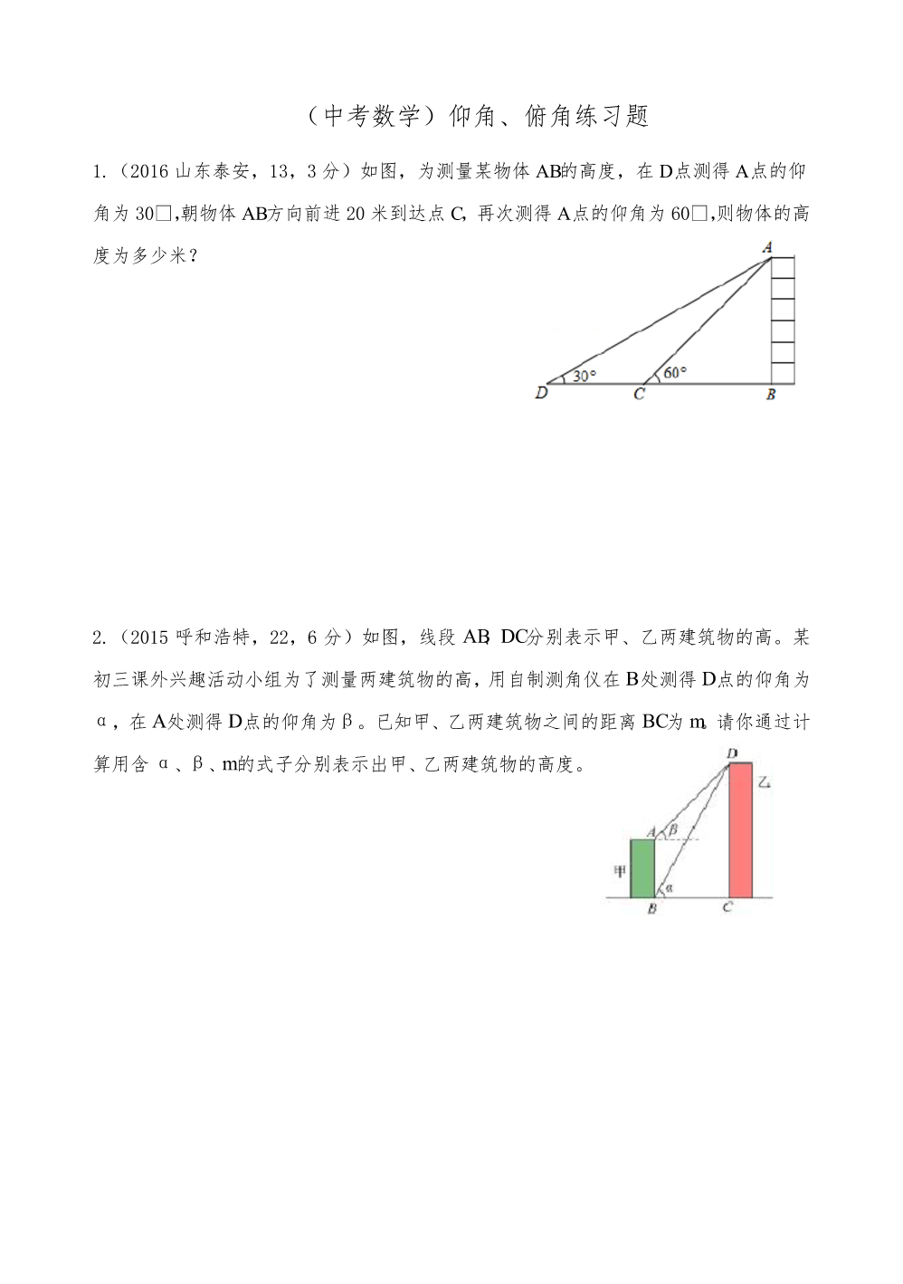 (中考数学)仰角、俯角练习题1.(2016山东泰安,13,3分)如图,为测量某物体AB的高度,在D点测得A点的仰角为30º,朝物体AB方向前进20米到达点C,再次测得A点的仰角为60º,则物体的高度为多少米?2.(2015呼和浩特,22,6分)如图,线段AB、DC分别表示甲、乙两建筑物的高。某初三课外兴趣活动小组为了测量两建筑物的高,用自制测角仪在B处测得D点的仰角为α,在A处测得D点的仰角为β。已知甲、乙两建筑物之间的距离BC为m。请你通过计算用含α、β、m的式子分别表示出甲、乙两建筑物的高度。3.(2