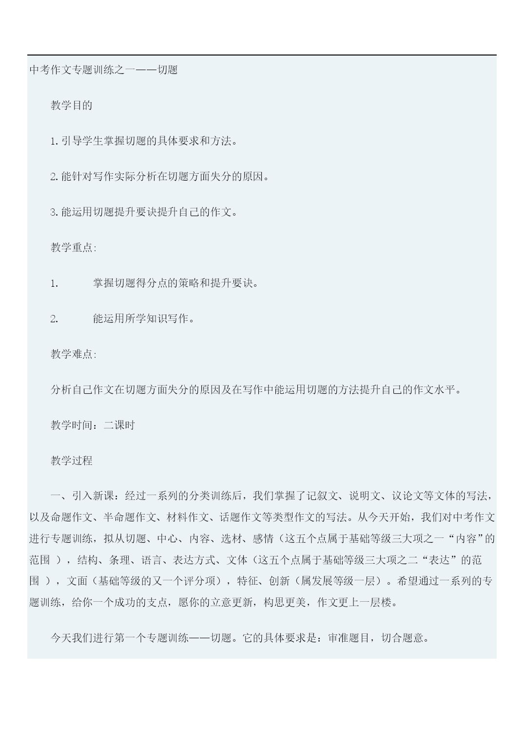 中考作文专题训练之一——切题教学目的1.引导学生掌握切题的具体要求和方法。2.能针对写作实际分析在切题方面失分的原因。3.能运用切题提升要诀提升自己的作文。教学重点:1.掌握切题得分点的策略和提升要诀。2.能运用所学知识写作。教学难点:分析自己作文在切题方面失分的原因及在写作中能运用切题的方法提升自己的作文水平。教学时间:二课时教学过程一、引入新课:经过一系列的分类训练后,我们掌握了记叙文、说明文、议论文等文体的写法,以及命题作文、半命题作文、材料作文、话题作文等类型作文的写法。从今天开始,我们对中考作文