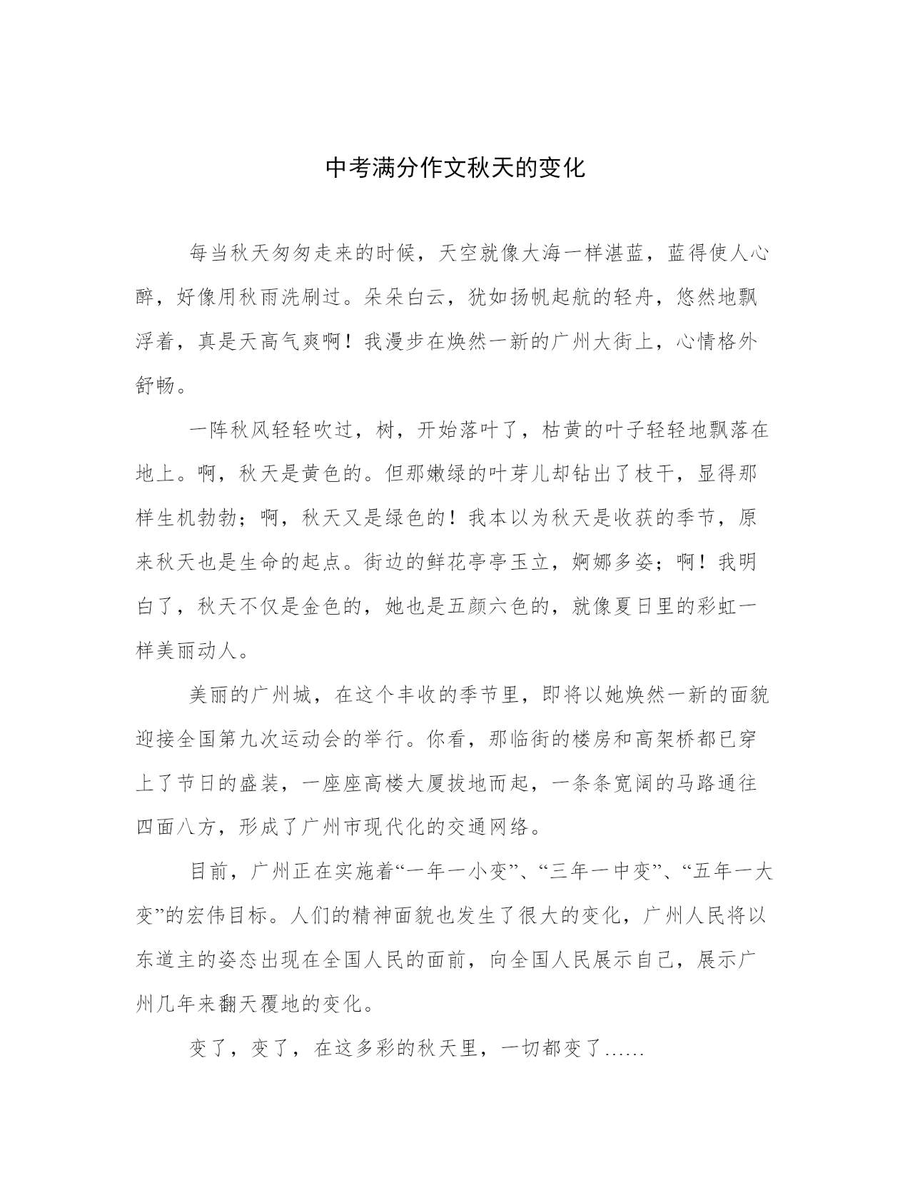 中考满分作文秋天的变化每当秋天匆匆走来的时候,天空就像大海一样湛蓝,蓝得使人心醉,好像用秋雨洗刷过。朵朵白云,犹如扬帆起航的轻舟,悠然地飘浮着,真是天高气爽啊!我漫步在焕然一新的广州大街上,心情格外舒畅。一阵秋风轻轻吹过,树,开始落叶了,枯黄的叶子轻轻地飘落在地上。啊,秋天是黄色的。但那嫩绿的叶芽儿却钻出了枝干,显得那样生机勃勃;啊,秋天又是绿色的!我本以为秋天是收获的季节,原来秋天也是生命的起点。街边的鲜花亭亭玉立,婀娜多姿;啊!我明白了,秋天不仅是金色的,她也是五颜六色的,就像夏日里的彩虹一样美丽动人
