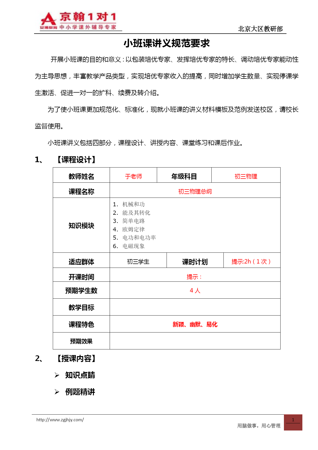 北京大区教研部HYPERLINK"http://www.zgjhjy.com/"http://www.zgjhjy.com/用脑做事,用心管理PAGE\*MERGEFORMAT15小班课讲义规范要求开展小班课的目的和意义:以包装培优专家、发挥培优专家的特长、调动培优专家能动性为主导思想,丰富教学产品类型,实现培优专家收入的提高,同时增加学生数量、实现停课学生激活、促进一对一的扩科、续费及转介绍。为了使小班课更加规范化、标准化,现就小班课的讲义材料模板及范例发送校区,请校长监督使用。小班课讲义包