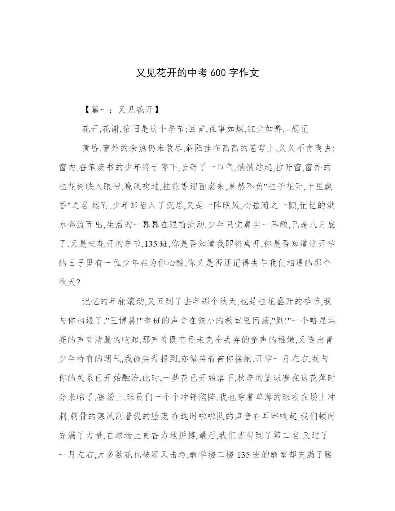 又见花开的中考600字作文【篇一:又见花开】花开,花谢,依旧是这个季节;回首,往事如烟,红尘如醉.--题记黄昏,窗外的余热仍未散尽,斜阳挂在高高的苍穹上,久久不肯离去;窗内,奋笔疾书的少年终于停下,长舒了一口气,悄悄站起,拉开窗,窗外的桂花树映入眼帘,晚风吹过,桂花香迎面袭来,果然不负"桂子花开,十里飘香"之名.然而,少年却陷入了沉思,又是一阵晚风,心弦随之一颤,记忆的洪水奔流而出,生活的一幕幕在眼前流动.少年只觉鼻尖一阵酸,已是八月底了.又是桂花开的季节,135班,你是否知道我即将离开,你是否知道这开学