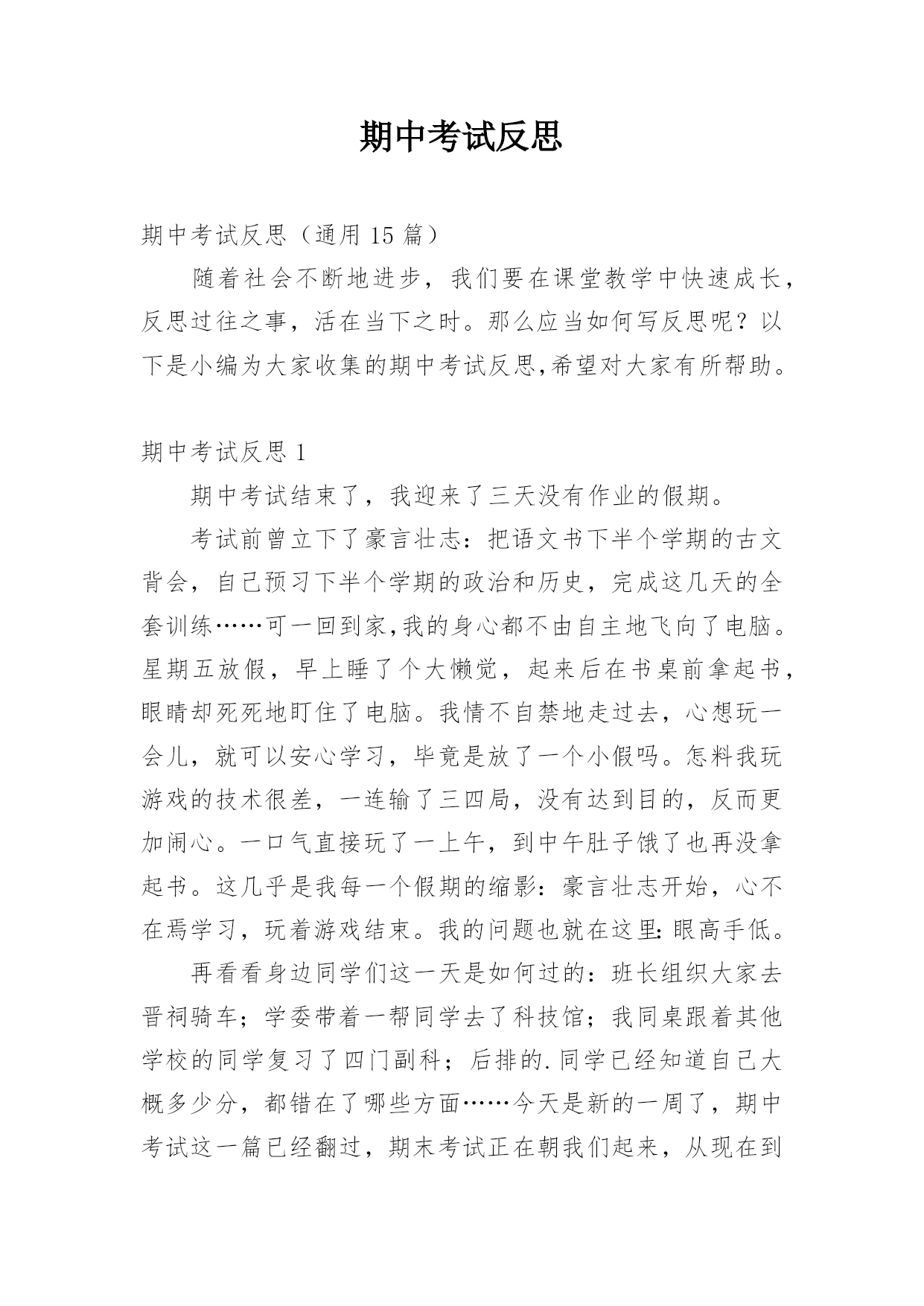 期中考试反思期中考试反思(通用15篇)随着社会不断地进步,我们要在课堂教学中快速成长,反思过往之事,活在当下之时。那么应当如何写反思呢?以下是小编为大家收集的期中考试反思,希望对大家有所帮助。期中考试反思1期中考试结束了,我迎来了三天没有作业的假期。考试前曾立下了豪言壮志:把语文书下半个学期的古文背会,自己预习下半个学期的政治和历史,完成这几天的全套训练……可一回到家,我的身心都不由自主地飞向了电脑。星期五放假,早上睡了个大懒觉,起来后在书桌前拿起书,眼睛却死死地盯住了电脑。我情不自禁地走过去,心想玩一会