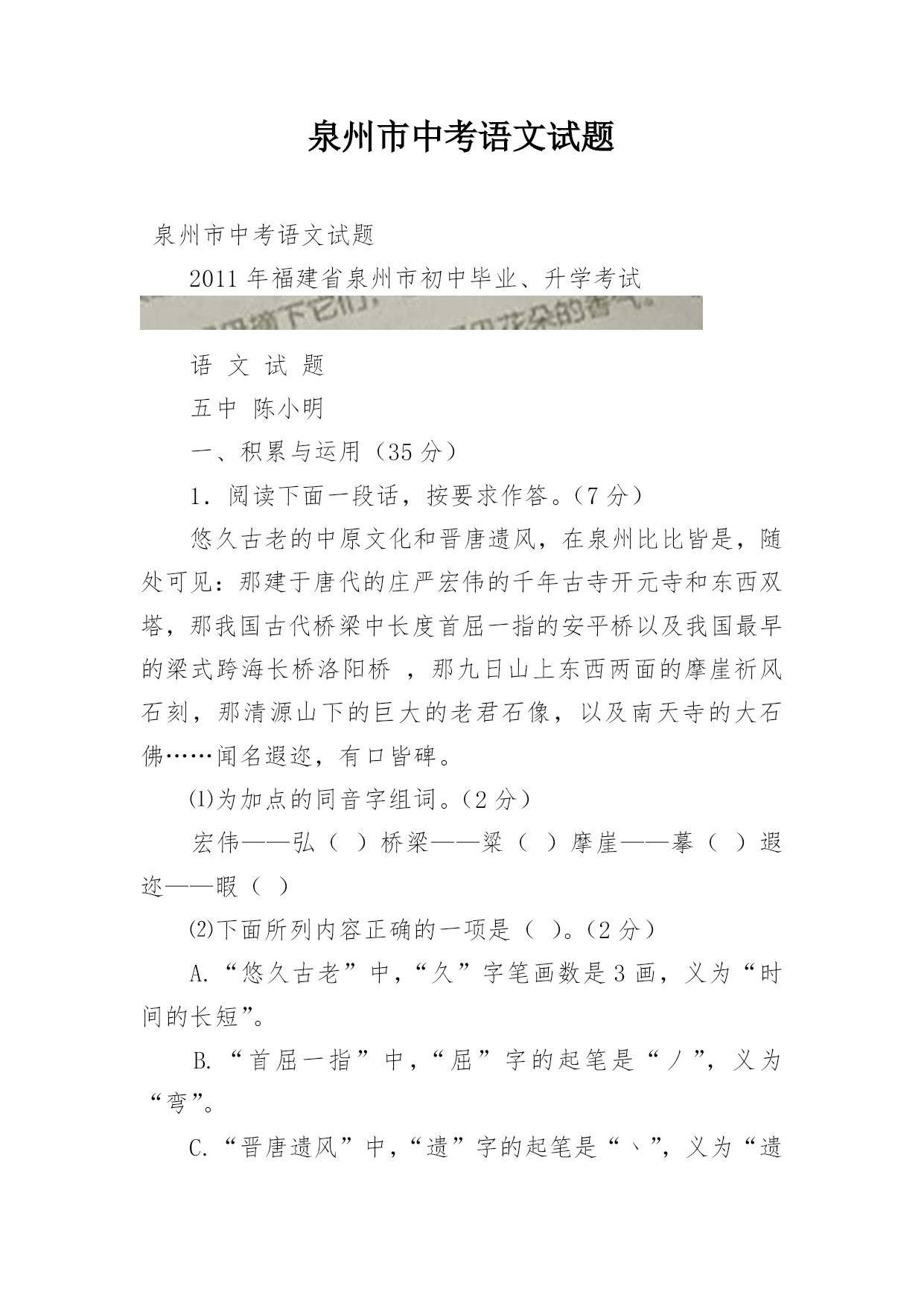 泉州市中考语文试题泉州市中考语文试题2011年福建省泉州市初中毕业、升学考试语文试题五中陈小明一、积累与运用(35分)1.阅读下面一段话,按要求作答。(7分)悠久古老的中原文化和晋唐遗风,在泉州比比皆是,随处可见:那建于唐代的庄严宏伟的千年古寺开元寺和东西双塔,那我国古代桥梁中长度首屈一指的安平桥以及我国最早的梁式跨海长桥洛阳桥,那九日山上东西两面的摩崖祈风石刻,那清源山下的巨大的老君石像,以及南天寺的大石佛……闻名遐迩,有口皆碑。⑴为加点的同音字组词。(2分)宏伟——弘()桥梁——粱()摩崖——摹()遐