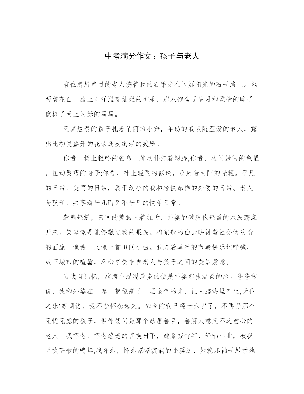 中考满分作文:孩子与老人有位慈眉善目的老人携着我的右手走在闪烁阳光的石子路上。她两鬓花白,脸上却洋溢着灿烂的神采,那双饱含了岁月和柔情的眸子像极了天上闪烁的星星。天真烂漫的孩子扎着俏丽的小辫,年幼的我紧随至爱的老人,露出比初夏盛开的花朵还要绚烂的笑靥。你看,树上轻吟的雀鸟,跳动扑打着翅膀;你看,丛间躲闪的兔鼠,扭动灵巧的身子;你看,叶上轻盈的露珠,反射着太阳的光耀。平凡的日常,美丽的日常,属于幼小的我和轻快慈祥的外婆的日常。老人与孩子,共享着平凡而又不平凡的快乐日常。蒲扇轻摇,田间的黄狗吐着红舌,外婆的皱