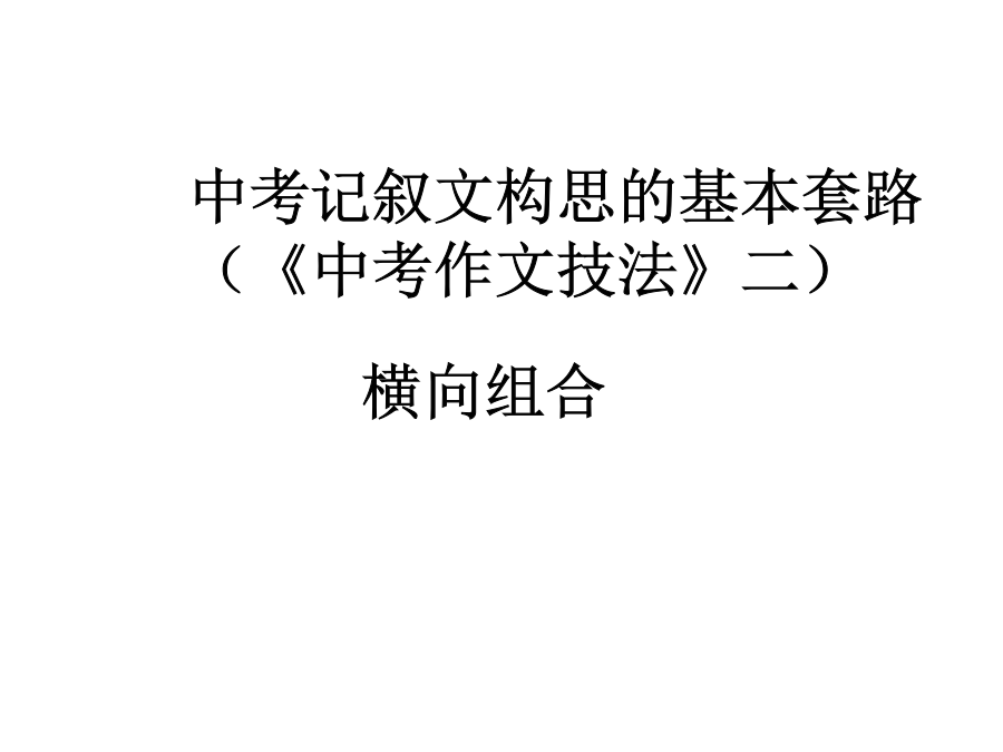 中考记叙文构思的基本套路(《中考作文技法》二)横向组合横向组合,就是在文章中将一个一个的情节、一个一个的小故事“加”起来,组合成一篇完整的文章。也就是我们常说的“横式结构法”。横式结构法”总的特点:用“板块”并列的结构,充分地多角度地表现人物、记叙事件、描写景物、表达感情。横式结构法”用于中考作文,最大的特点就是作文的文面清晰,文章的主体内容让人一目了然,而且由于使用的人不多,评卷老师会给予足够的赞赏。运用横向组合的构思套路,重要的一点就是要掌握若干种“组合”的方法。这其中的最为重要的,就是要学会在作文中