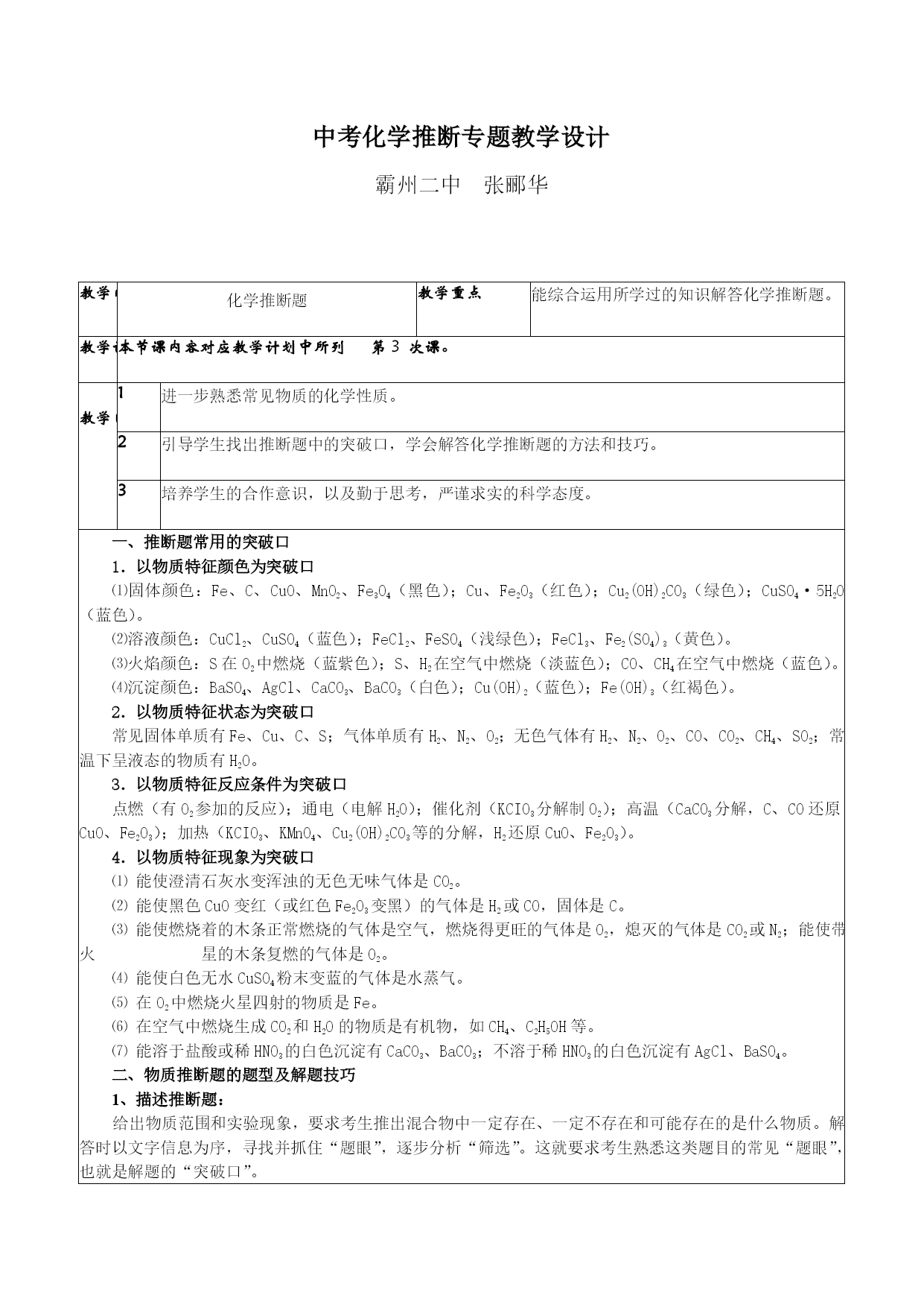 中考化学推断专题教学设计霸州二中张郦华教学内容化学推断题教学重点能综合运用所学过的知识解答化学推断题。教学计划本节课内容对应教学计划中所列第3次课。教学目标1进一步熟悉常见物质的化学性质。2引导学生找出推断题中的突破口,学会解答化学推断题的方法和技巧。3培养学生的合作意识,以及勤于思考,严谨求实的科学态度。一、推断题常用的突破口1.以物质特征颜色为突破口⑴固体颜色:Fe、C、CuO、MnO2、Fe3O4(黑色);Cu、Fe2O3(红色);Cu2(OH)2CO3(绿色);CuSO4·5H2O(蓝色)。⑵溶液