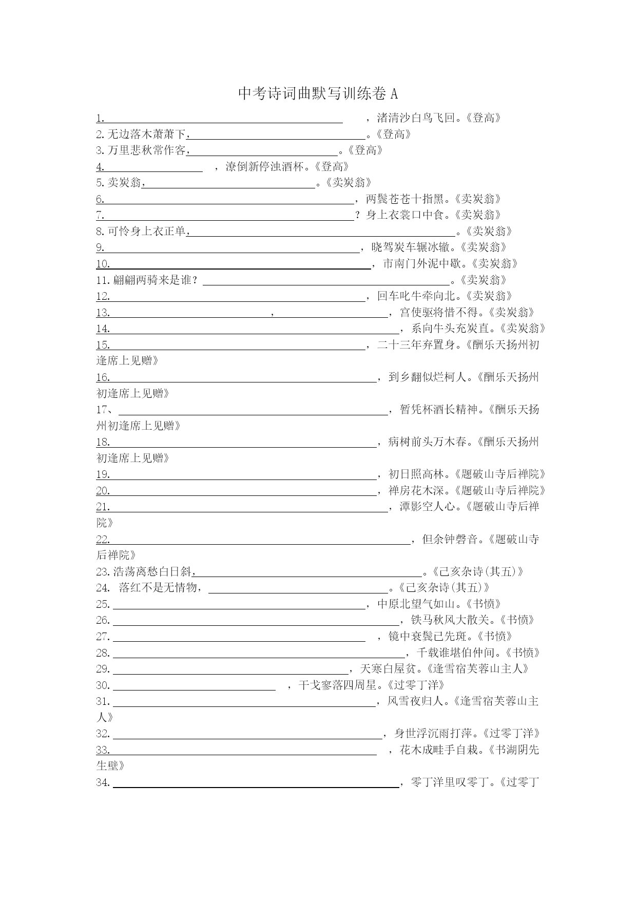 中考诗词曲默写训练卷A1.,渚清沙白鸟飞回。《登高》2.无边落木萧萧下,。《登高》3.万里悲秋常作客,。《登高》4.,潦倒新停浊酒杯。《登高》5.卖炭翁,。《卖炭翁》6.,两鬓苍苍十指黑。《卖炭翁》7.?身上衣裳口中食。《卖炭翁》8.可怜身上衣正单,。《卖炭翁》9.,晓驾炭车辗冰辙。《卖炭翁》10.,市南门外泥中歇。《卖炭翁》11.翩翩两骑来是谁?。《卖炭翁》12.,回车叱牛牵向北。《卖炭翁》13.,,宫使驱将惜不得。《卖炭翁》14.,系向牛头充炭直。《卖炭翁》15.,二十三年弃置身。《酬乐天扬州初逢席上