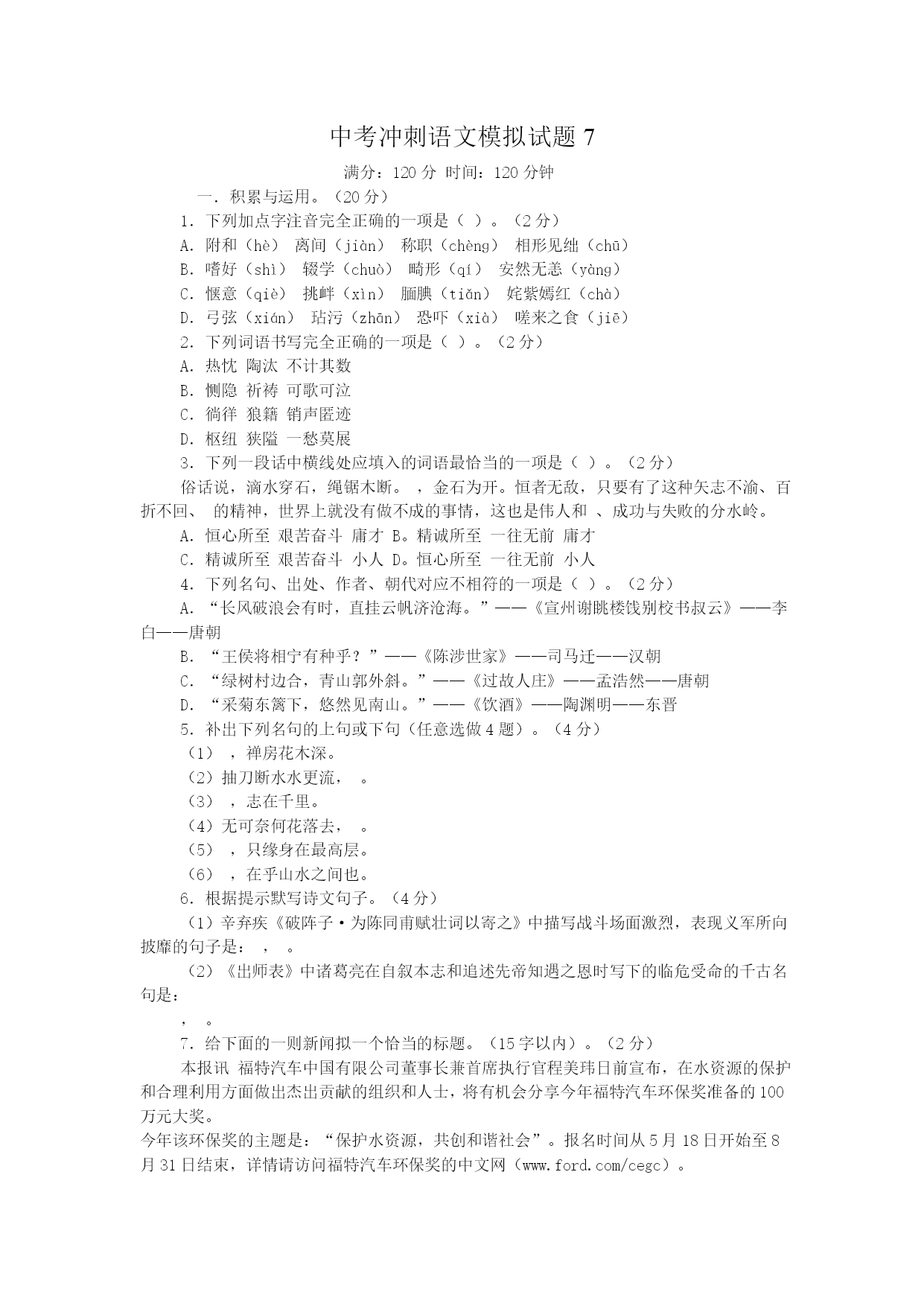 中考冲刺语文模拟试题7满分:120分时间:120分钟一.积累与运用。(20分)1.下列加点字注音完全正确的一项是()。(2分)A.附和(hè)离间(jiàn)称职(chènɡ)相形见绌(chū)B.嗜好(shì)辍学(chuò)畸形(qí)安然无恙(yànɡ)C.惬意(qiè)挑衅(xìn)腼腆(tiǎn)姹紫嫣红(chà)D.弓弦(xián)玷污(zhān)恐吓(xià)嗟来之食(jiē)2.下列词语书写完全正确的一项是()。(2分)A.热忱陶汰不计其数B.恻隐祈祷可歌可泣C.徜徉狼籍销声匿迹D.枢纽狭